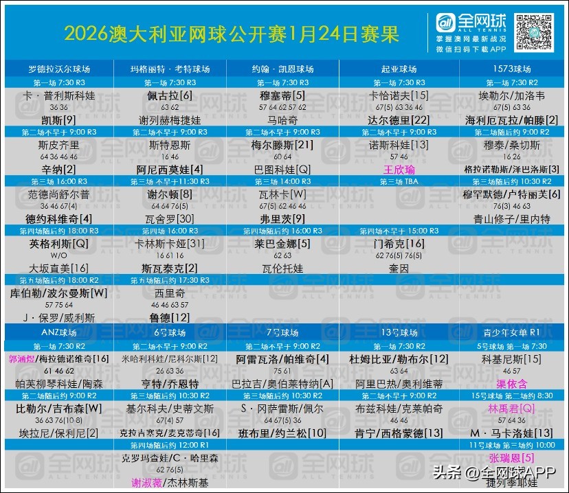 On January 24, 2026, Beijing time, the seventh day of the main draw at the Australian Open concluded, with all spots for the men’s and women’s singles round of 16 decided. Chinese star Wang Xinyu defeated the 13th seed Noskova in straight sets, 7-5, 6-4, advancing to her first-ever women’s singles round of 16 at the Australian Open.