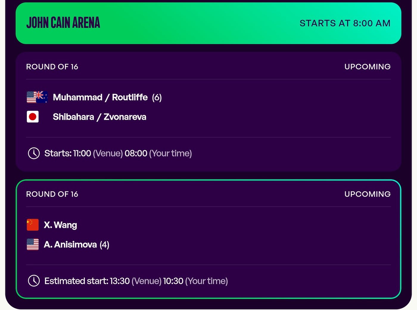 According to the WTA official schedule, the Wang Xinyu vs. Anisimova match will not begin before 10:30 AM tomorrow (because the previous match may last an unpredictable amount of time, Wang’s match start time could be postponed).