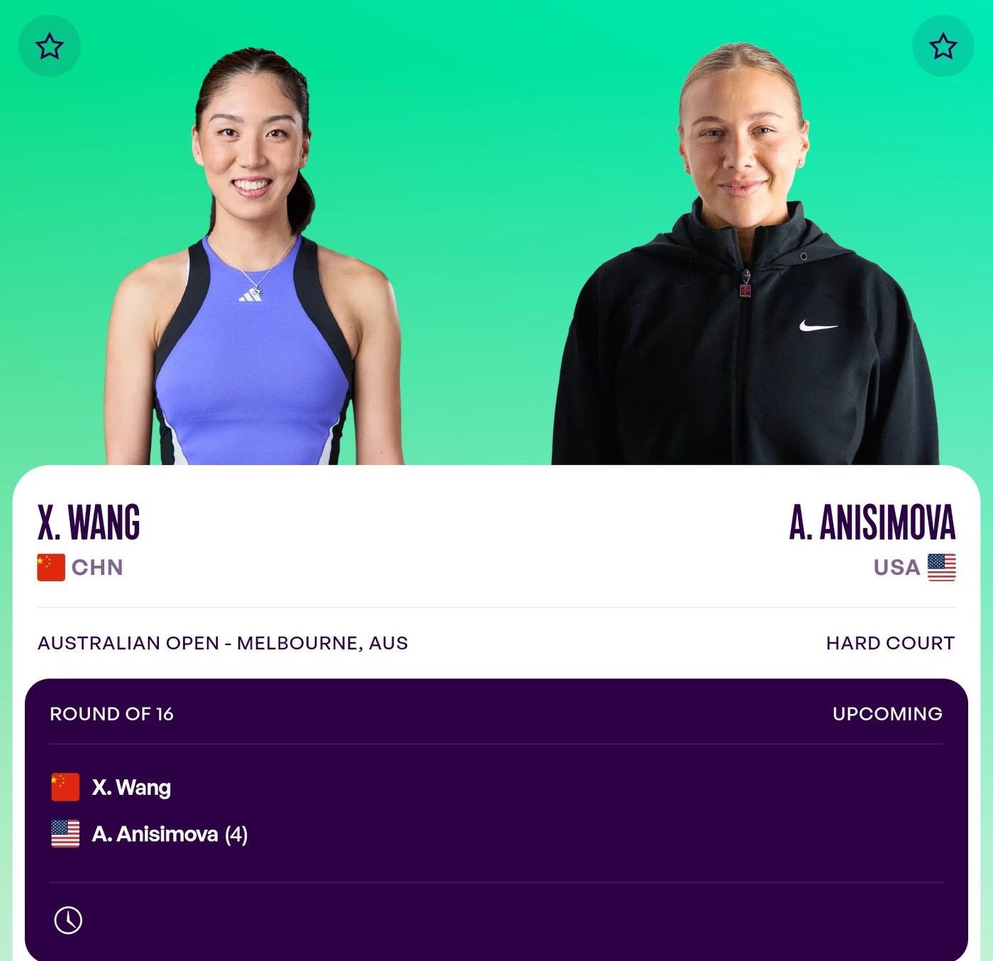 The Australian Open women's singles round of 16 match tomorrow (1.26) will see Wang Xinyu face Anisimova, live on CCTV-5 and Yangshipin.