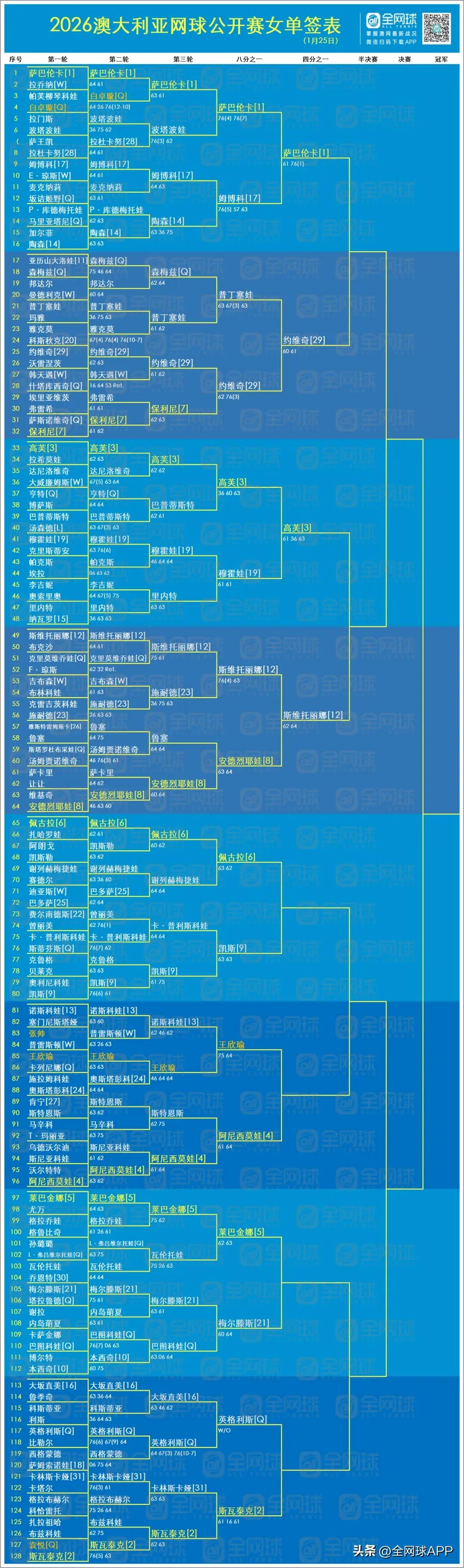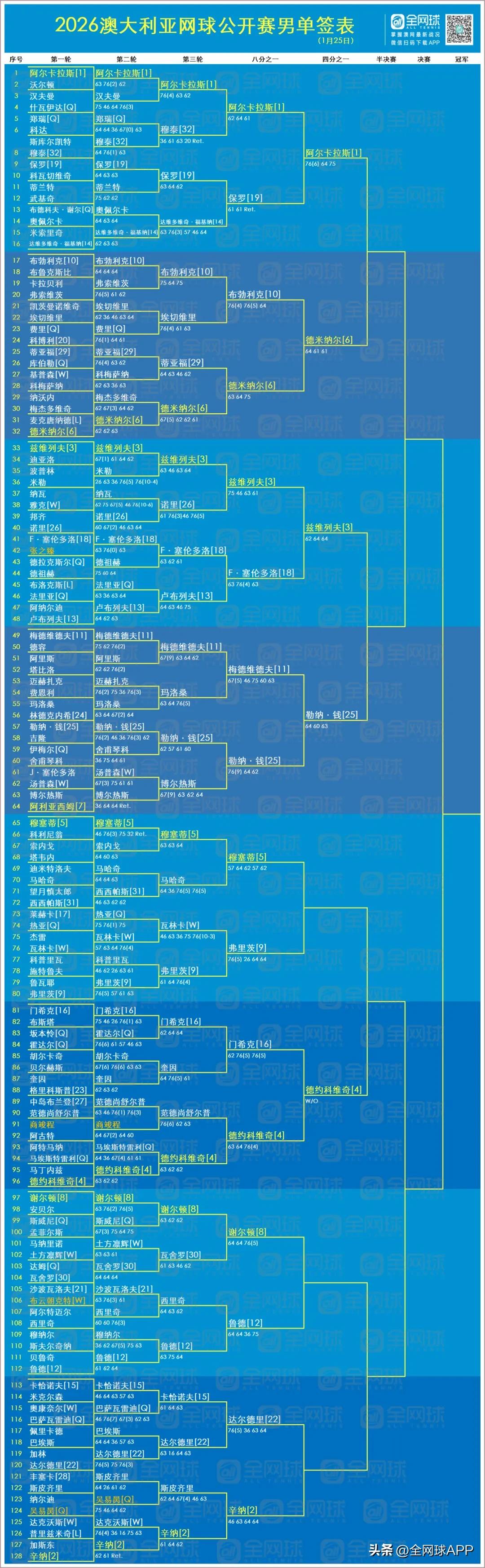 In the men's singles, the highly anticipated "Medvedev vs. Qian" match did not turn into the marathon many expected. Lerner Qian won in straight sets 6-4/6-0/6-3, including an 11-game streak mid-match, almost handing Medvedev a “double bagel.” With this victory, Qian has beaten his opponent at the Australian Open for two consecutive years and reached his first Grand Slam quarterfinal. He will next face Zverev, who also won in three sets 6-2/6-4/6-4 against 18th seed Cerundolo.