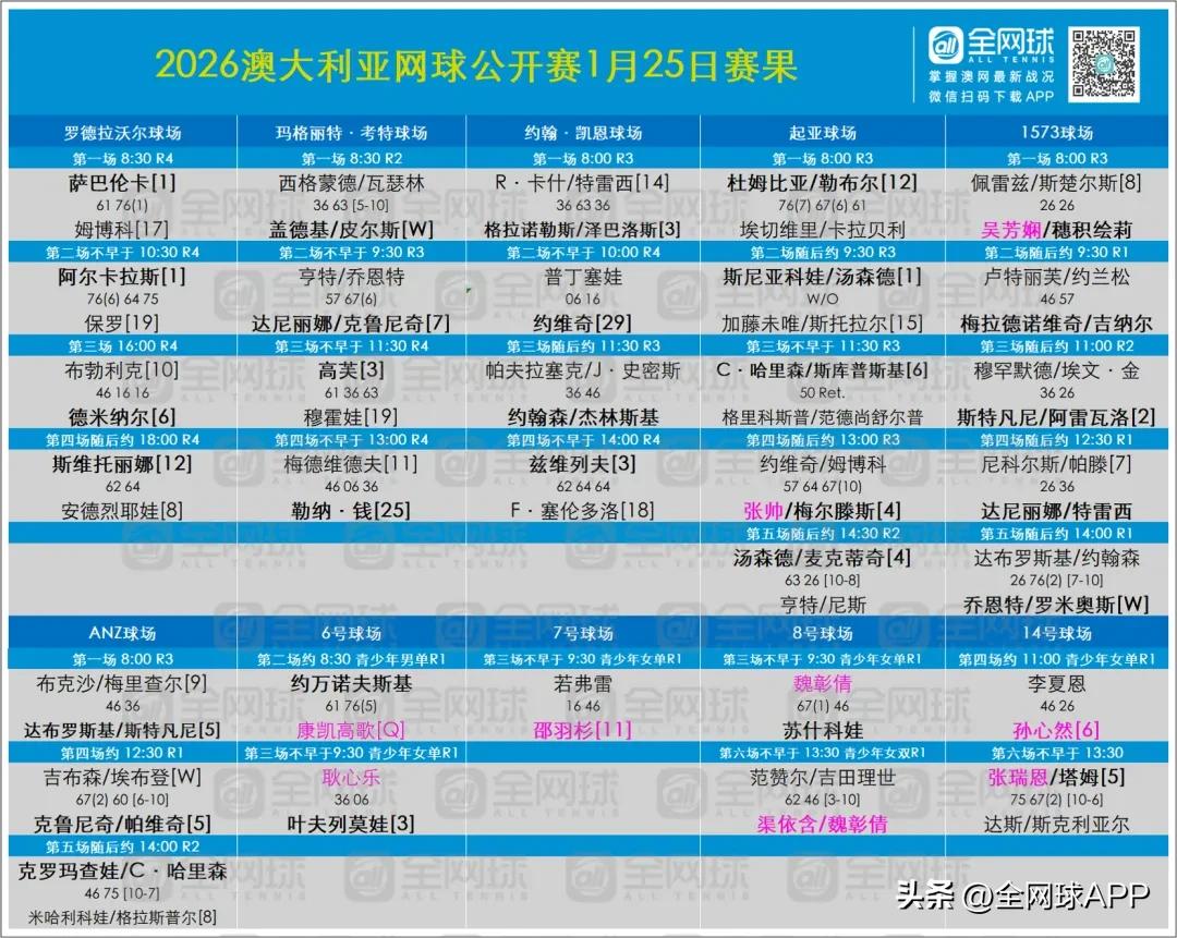 On January 25, 2026, Beijing time, the first week of the Australian Open concluded, with the battle for the men's and women's singles quarterfinal spots intensifying.