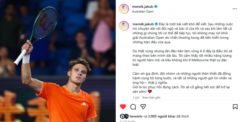"This is very difficult news to share. After doing everything possible to keep playing, I have to withdraw from the Australian Open due to the worsening abdominal muscle injury.", Mensik wrote on Instagram. "After thorough discussions with my coaching team and doctors, we decided not to compete tomorrow."