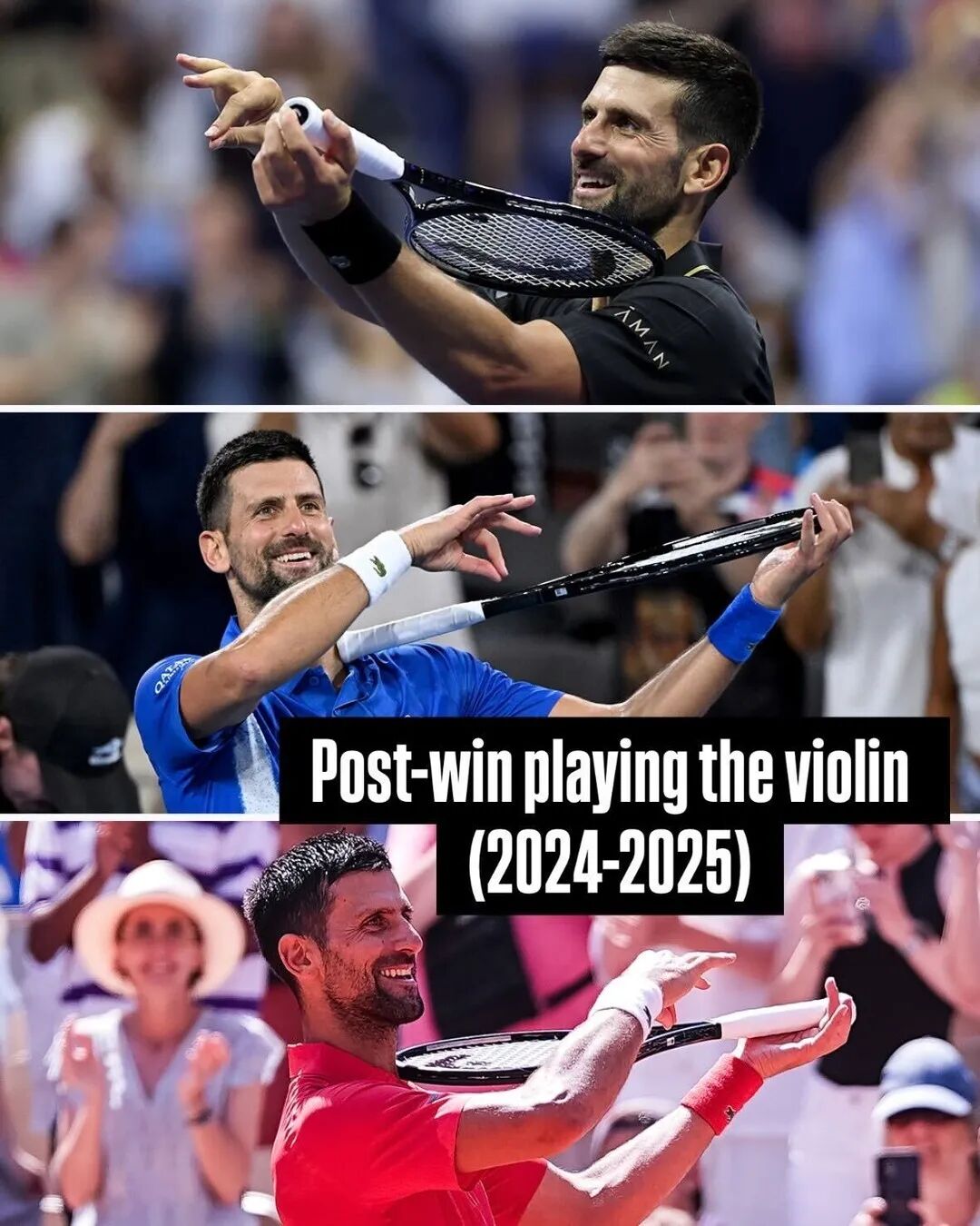 From tearing his shirt at the Australian Open, to eating grass at Wimbledon, to mimicking a phone hang-up at the US Open, continuing through the splits in 2025 and violin-playing at the 2026 Australian Open, Djokovic has showcased a variety of celebration styles over his 20-plus year career.