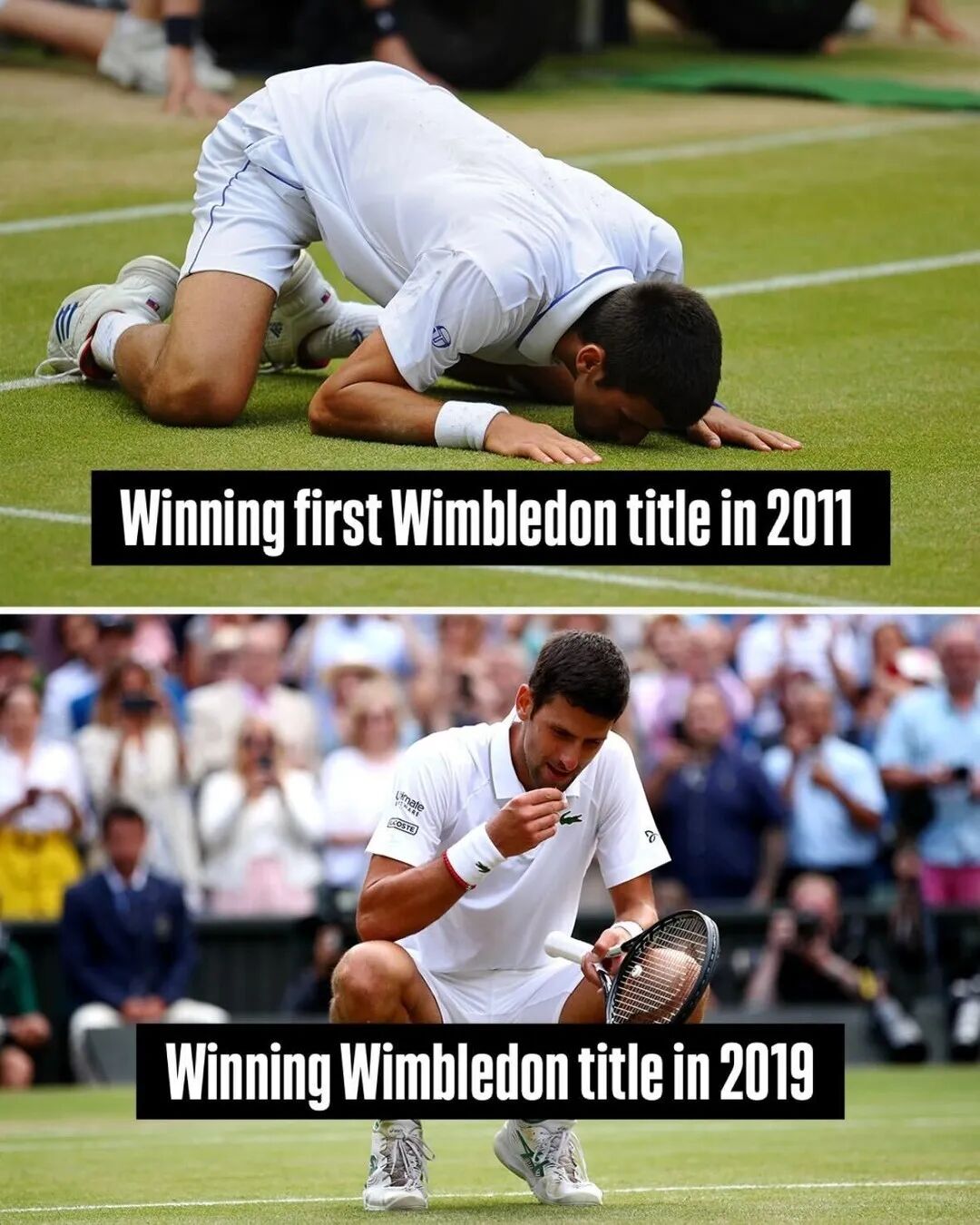 In the 2018 Wimbledon final, Djokovic again ate grass after a 3-0 victory over Anderson. Having just returned from an elbow injury slump, this gesture was interpreted as an emotional release for his regained peak form at Wimbledon.