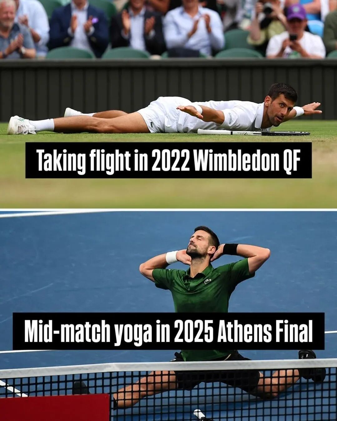 In 2025 at Wimbledon, Djokovic reached 100 wins on the grass, celebrating again with a split. At the 2025 Athens tournament, after winning a point, he spontaneously performed a full split.