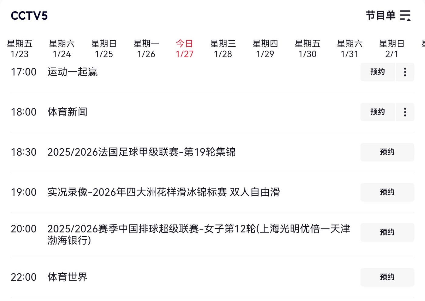 The Women's Volleyball Super League schedule for today (2026.1.27) includes Shanghai vs. Tianjin and Henan vs. Liaoning, with live coverage on CCTV-5 and Yangshipin.