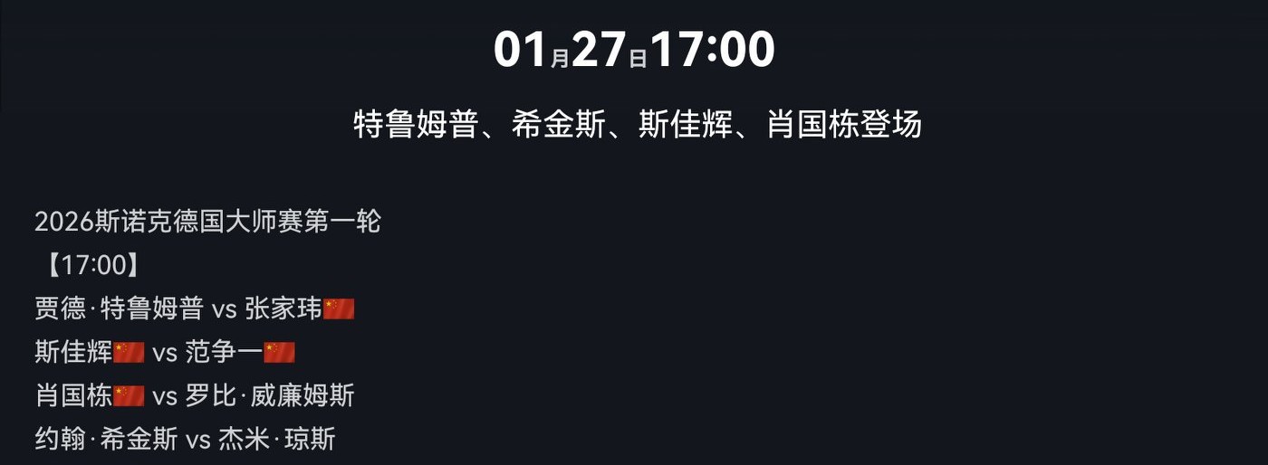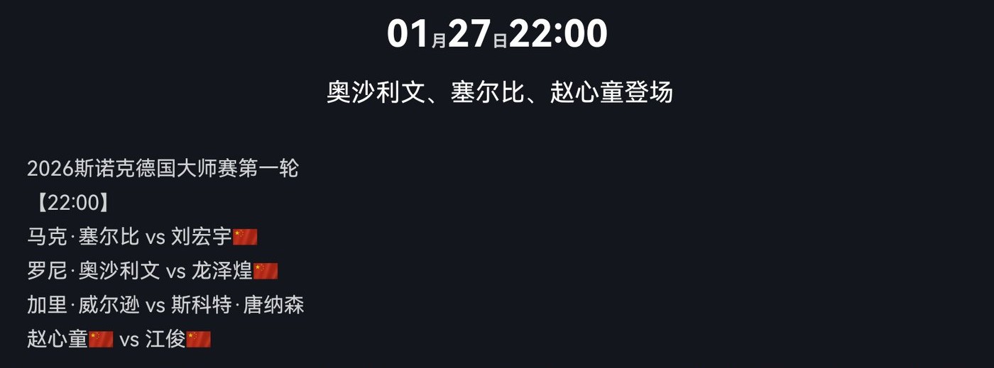The Snooker German Masters schedule for today (2026.1.27), with Zhao Xintong and others participating, broadcast on Migu Video + Huya Live.