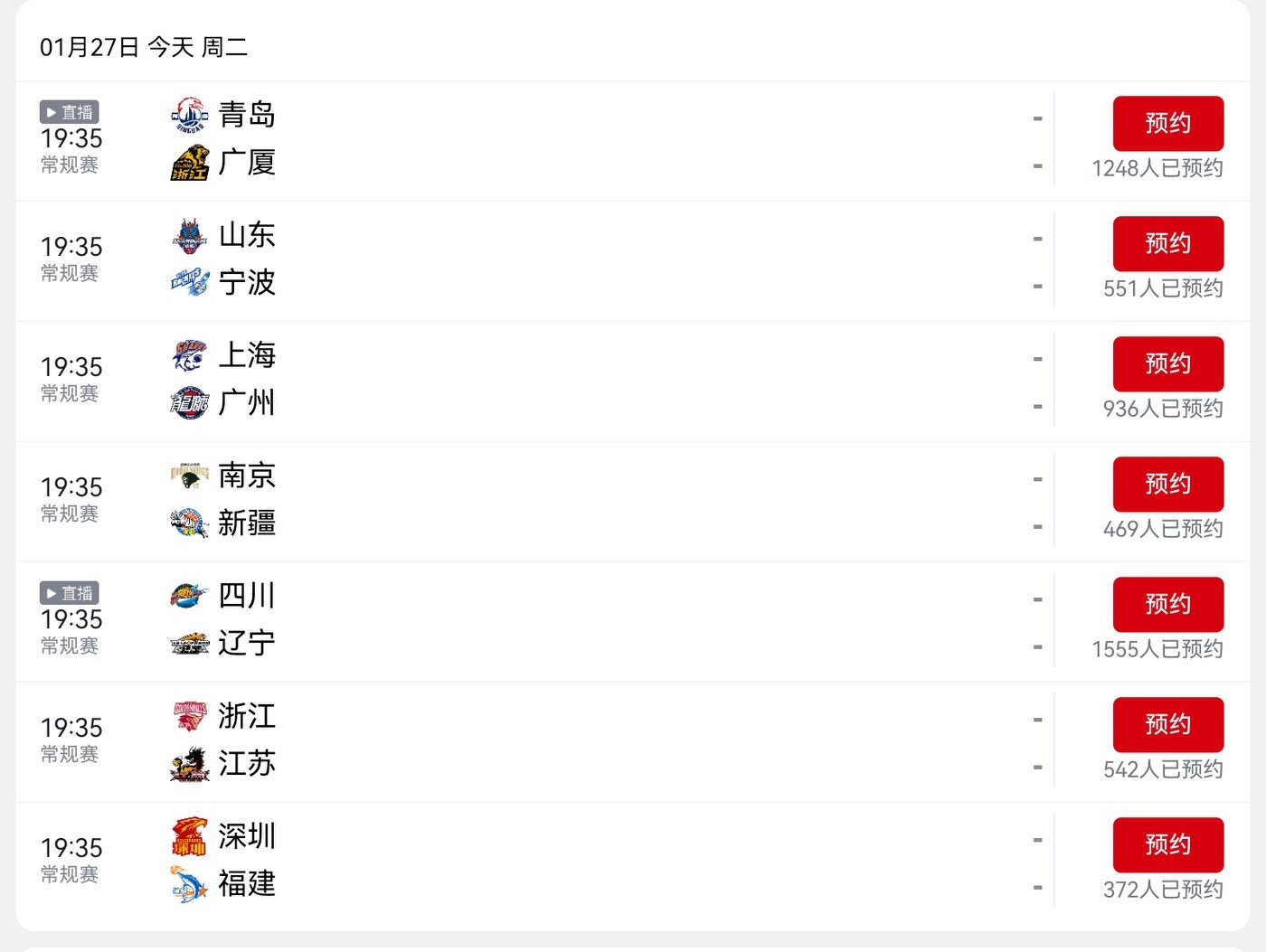 CBA schedule today (1.27): Qingdao Laoshan Beer vs Zhejiang Fangxingdu, live on CCTV-5+.
