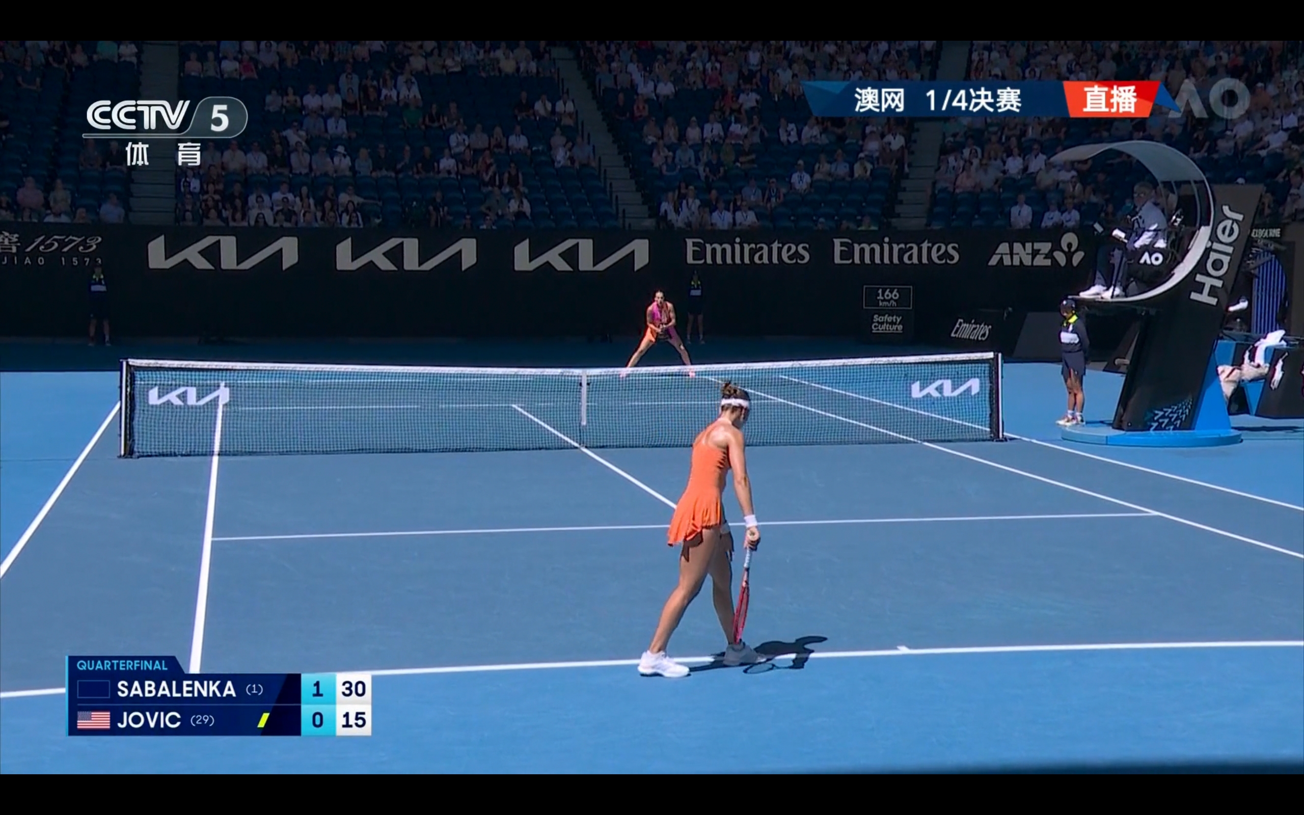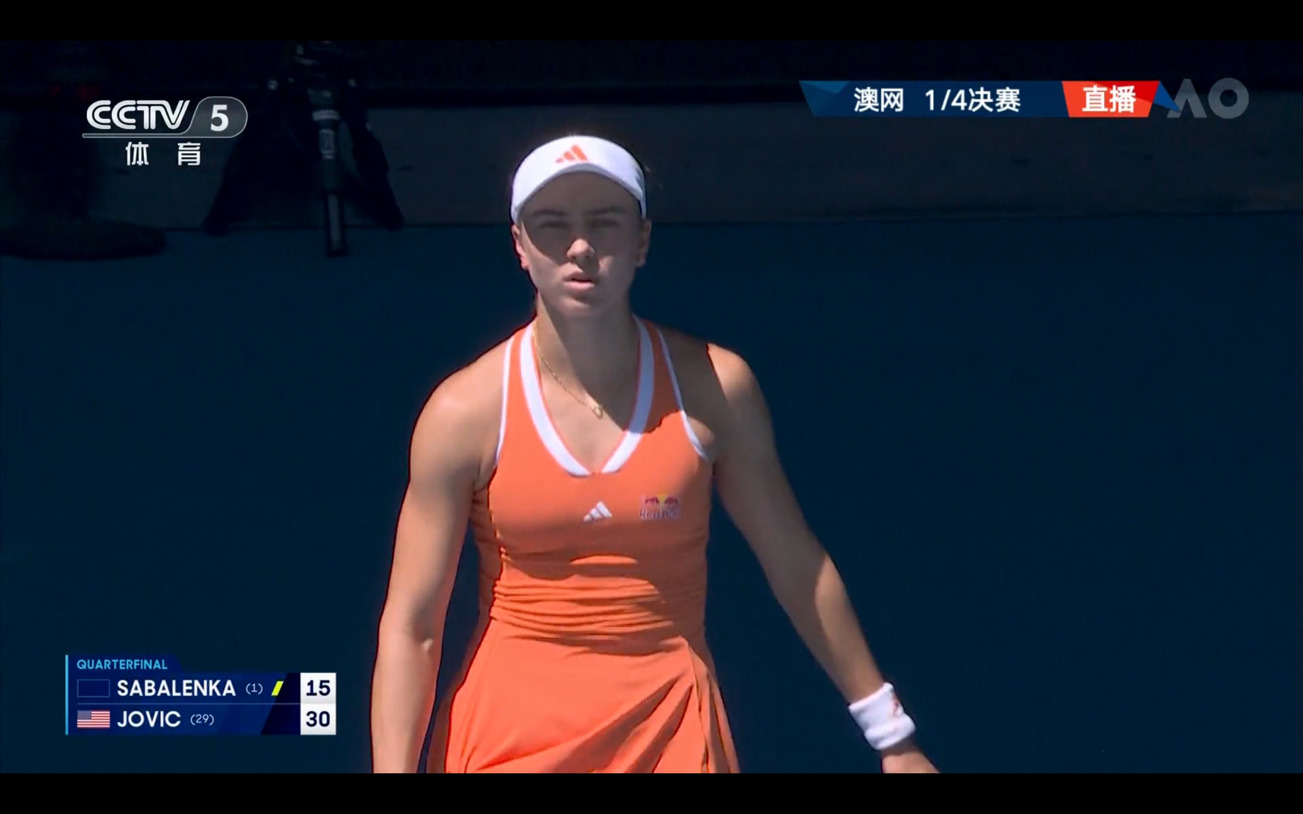CCTV-5 and Yangshipin are currently providing free live broadcasts of the Australian Open women's singles quarterfinal between Sabalenka and Jovic.