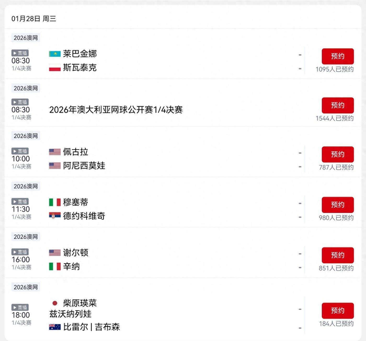 CCTV-5 and the CCTV Video app have announced the live coverage plan for the Australian Open on January 28, 2026, with Swiatek, Anisimova, Djokovic, and Sinner participating.