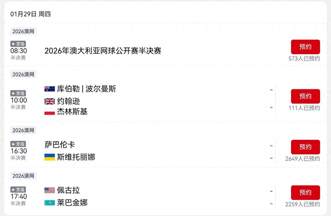 CCTV-5 has announced the live broadcast plan for the Australian Open tomorrow (January 29, 2026), which will showcase two women's singles semifinals including Sabalenka and Rybakina.