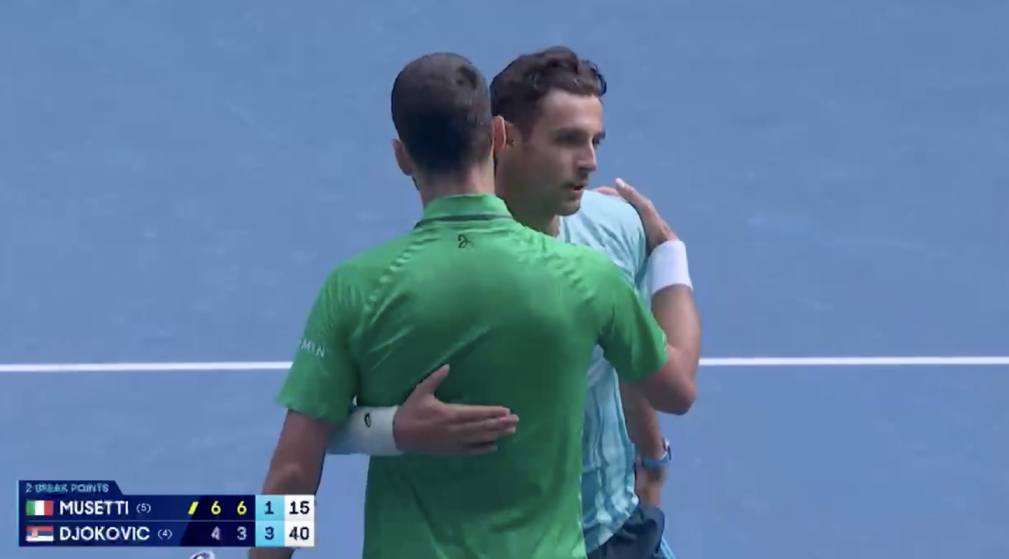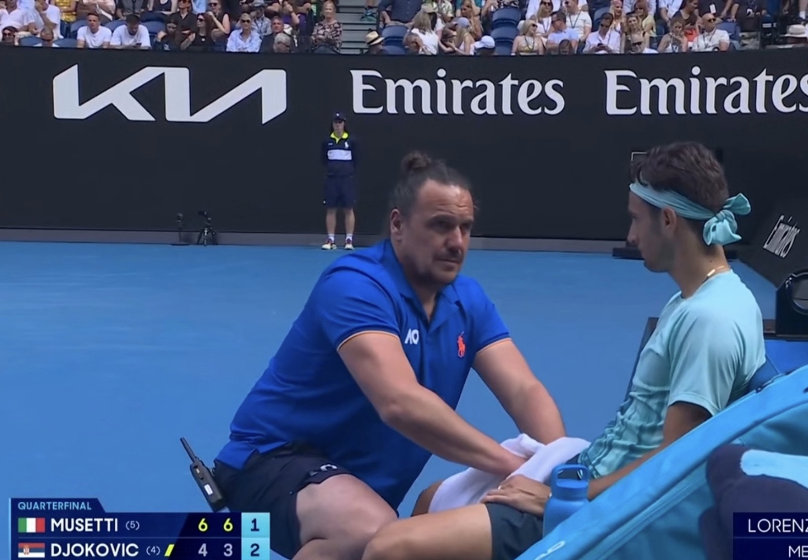 As he removed his headband and approached Djokovic, the Italian's face showed clear frustration. Having reached the Australian Open quarterfinals and climbed to a career-high world ranking of third, he was on the brink of his first semifinal appearance at this major. Musetti has struggled with injuries in recent years, retiring in the deciding set of the 2025 China Open quarterfinals, withdrawing from two South American tournaments earlier that year due to a calf strain, and showing minor injuries in both the warm-up and first round of this Australian Open. Despite this, he defeated an injured Fritz to reach the quarterfinals for the first time here, completing the feat of reaching the quarters in all four Grand Slams.