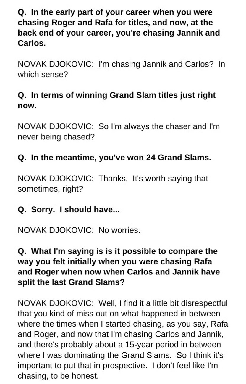 The reporter clarified, “I mean in terms of winning Grand Slam titles at this stage.” Djokovic immediately asked again, “So I am always the chaser, never the one being chased?”