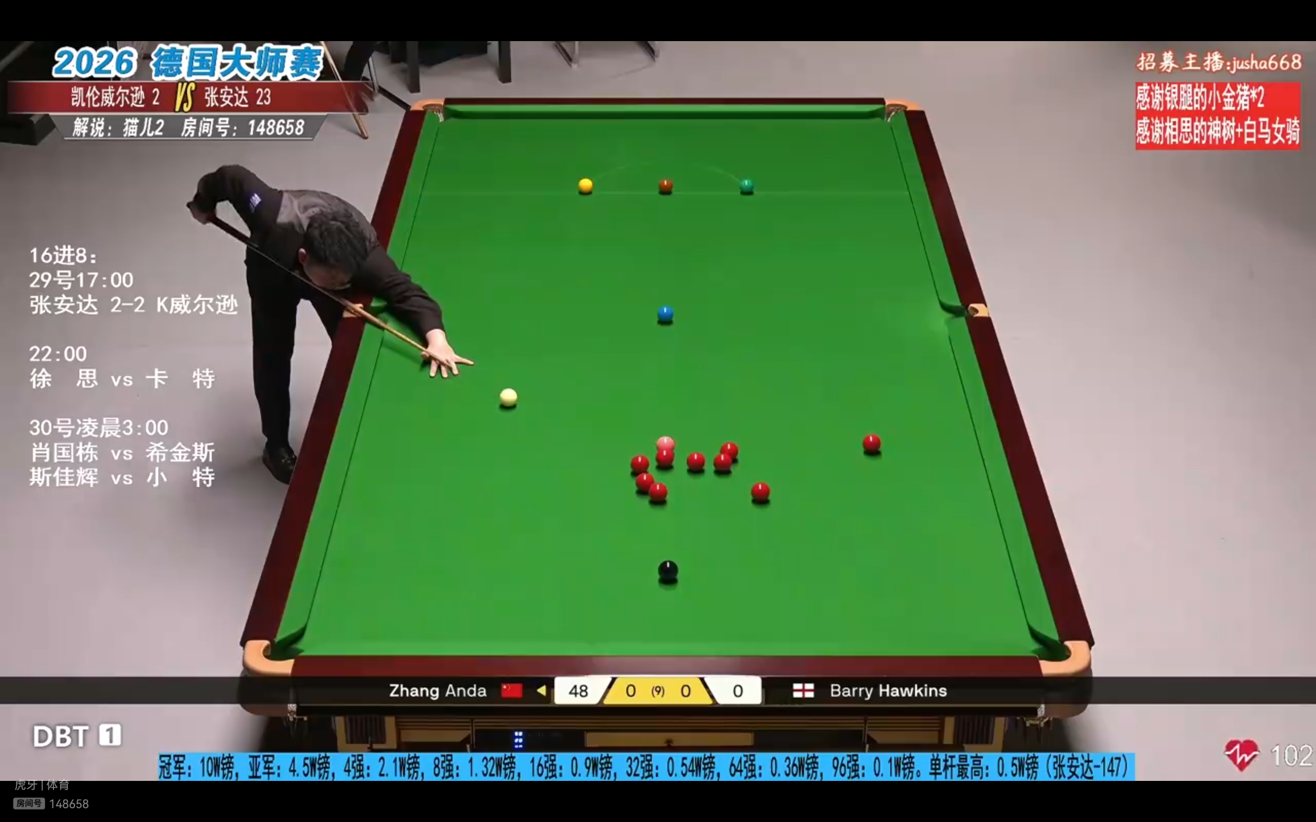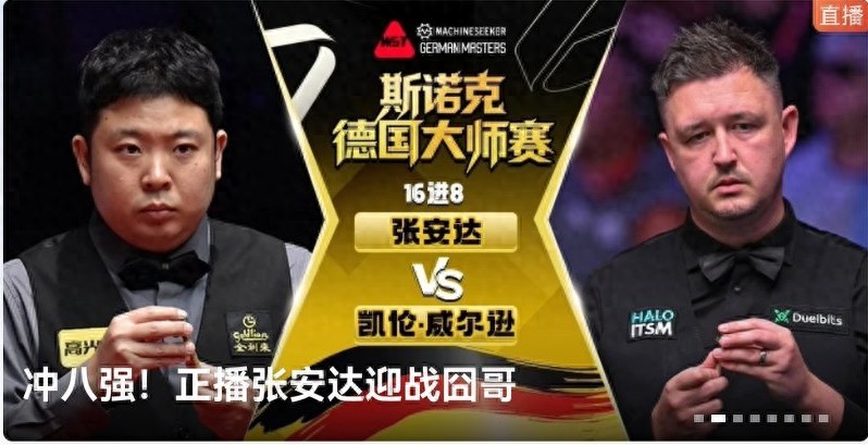 Migu Video and Huya streaming platforms are live streaming the Snooker German Masters Round of 16 match between Zhang Anda and Kyren Wilson.