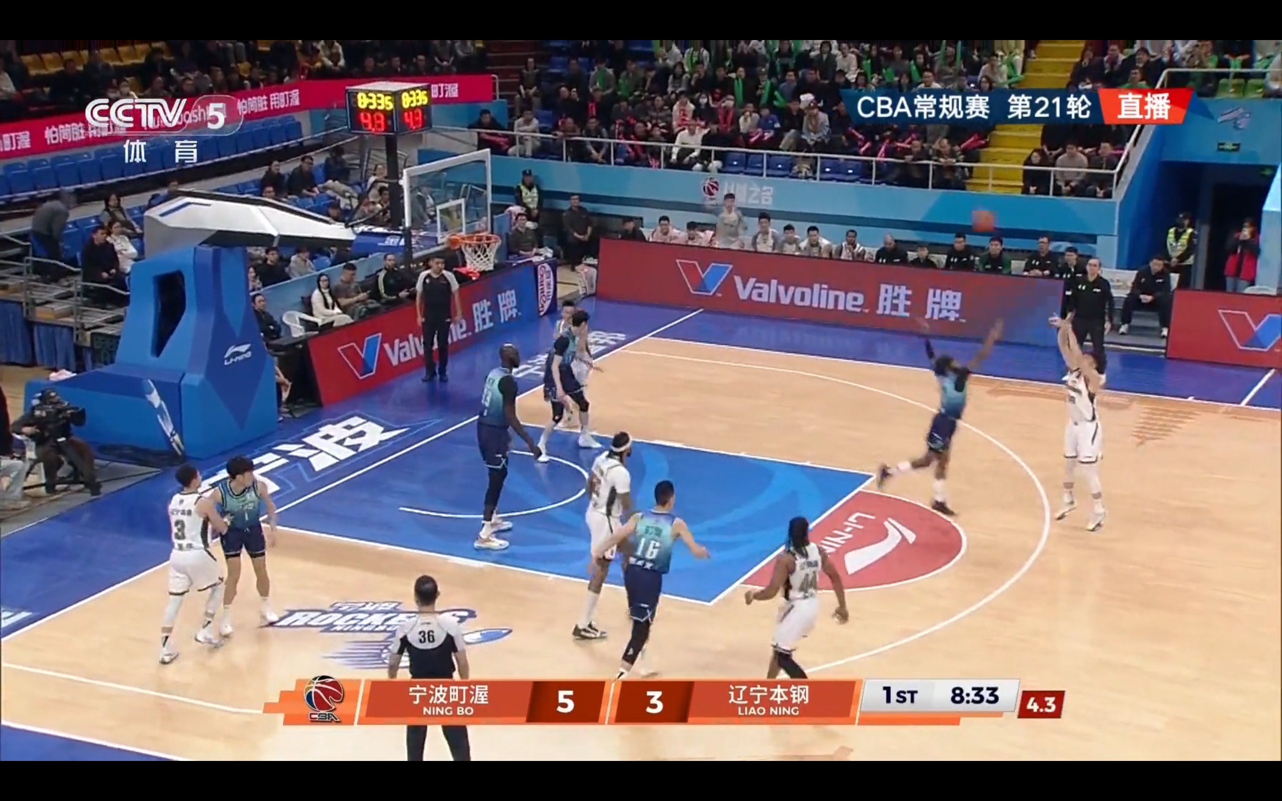 CCTV-5 and Yangshipin are broadcasting the 21st round CBA match between Ningbo Town Wuzhou and Liaoning Bengang.