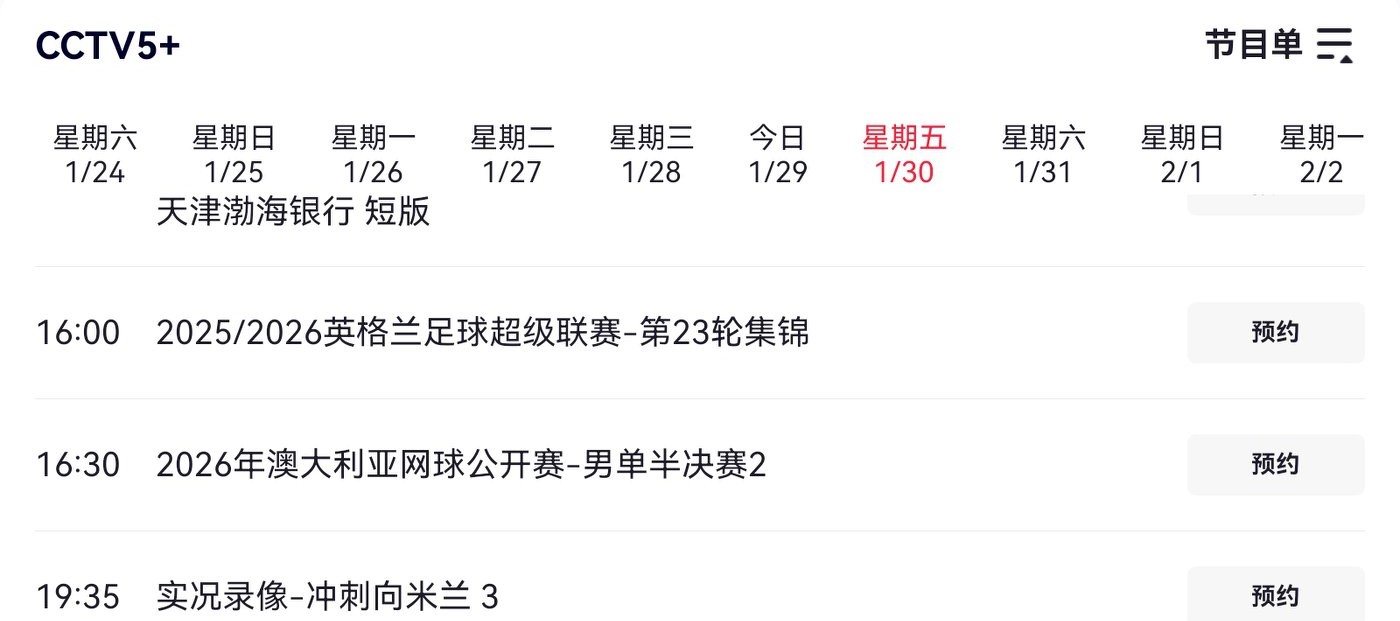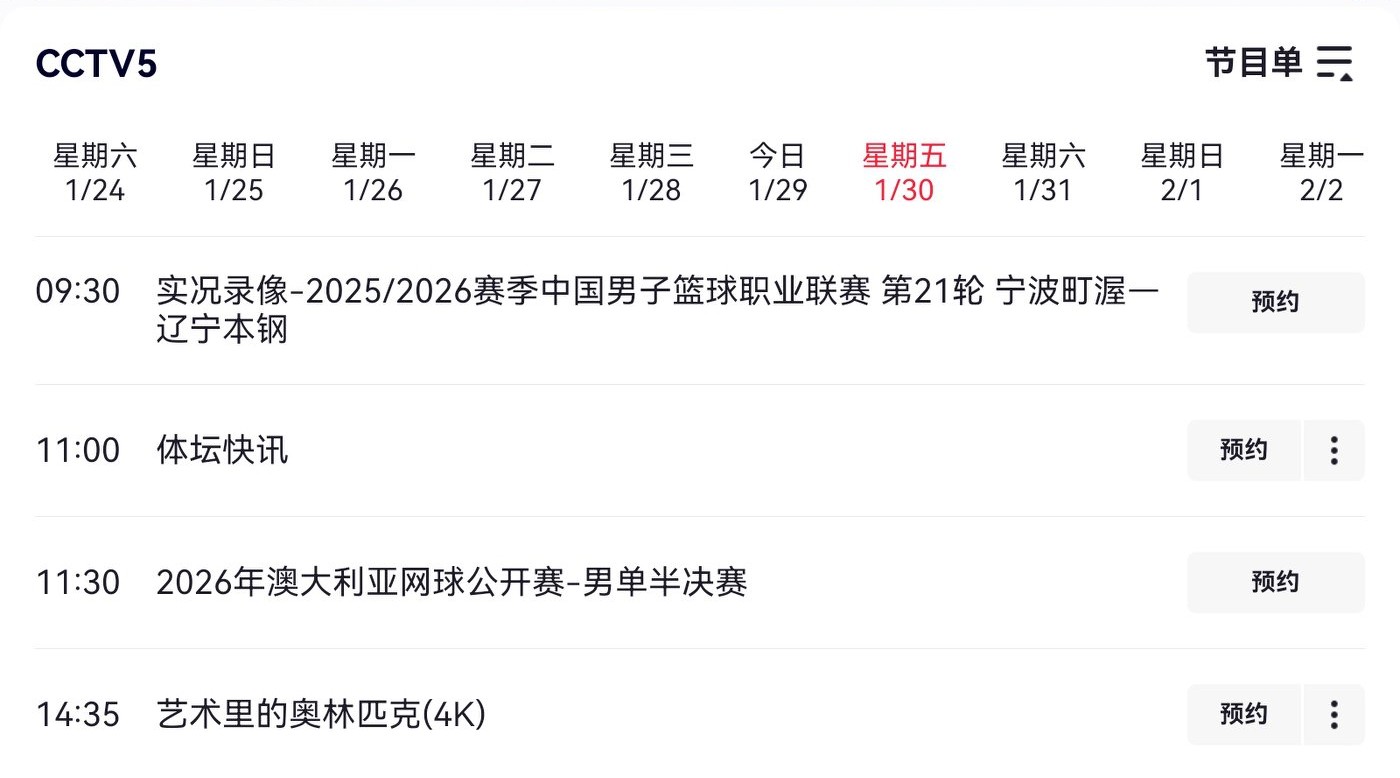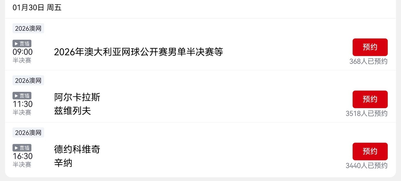 Tomorrow's (2026.1.30) Australian Open schedule features Alcaraz, Sinner, Djokovic, and Zverev, with live coverage on CCTV-5.