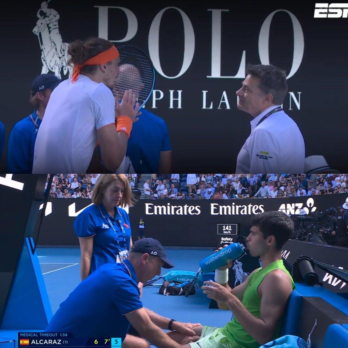 Zverev played strongly, but after the Spaniard took a 6–4, 7–6(5) lead, the match took an unexpected turn. As the contest progressed, Alcaraz appeared to struggle physically, and when he finally requested a medical timeout, it clearly upset Zverev.