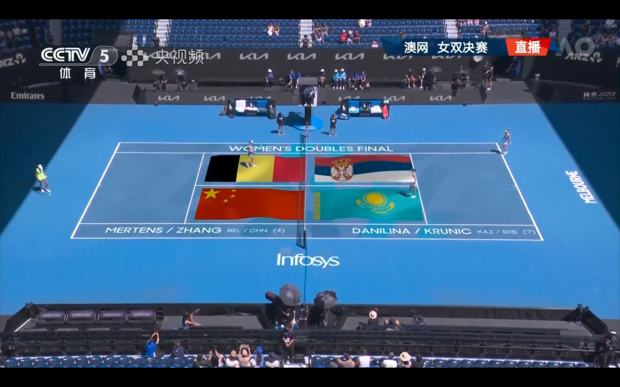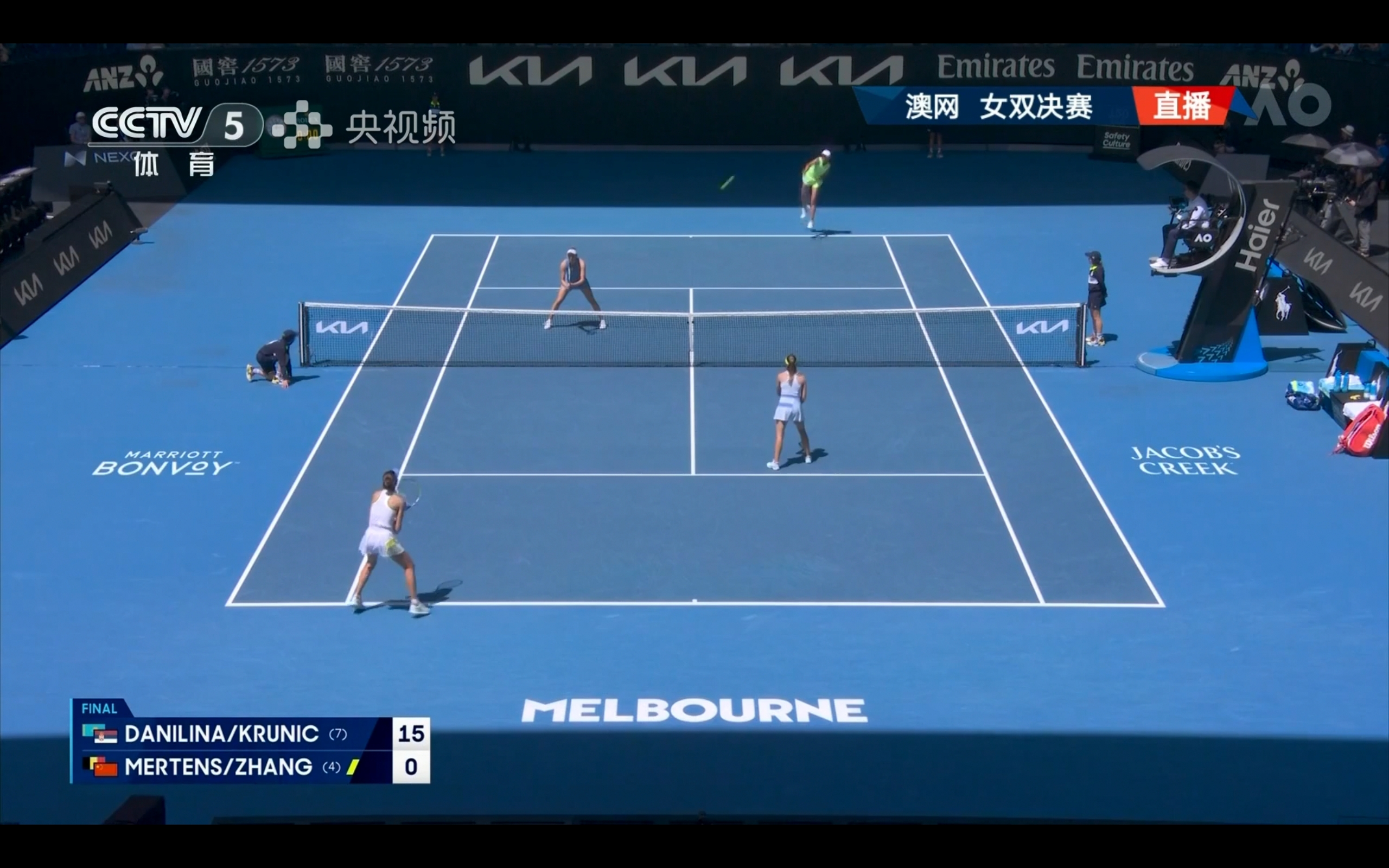 CCTV-5和央視頻正在免費直播澳網女雙決賽張帥/梅爾滕斯對陣達尼麗娜/克魯尼奇的比賽。