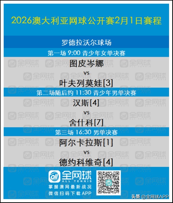 The men's singles final between world No.1 Alcaraz and the ten-time titleholder Djokovic will begin at 16:30 Beijing time on February 1. The winner will make history: if Alcaraz triumphs, he will become the youngest male player ever to complete a career Grand Slam; if Djokovic wins, he will claim his 25th Grand Slam singles title, surpassing Margaret Court to hold the record for the most Grand Slam singles titles in tennis history.