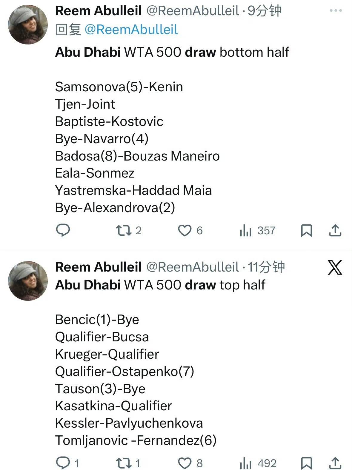 After the withdrawal news broke, the WTA Abu Dhabi draw was adjusted. With Zheng Qinwen and newly crowned Australian Open champion Leylah Fernandez both withdrawing for rest, defending champion Belinda Bencic became the top seed.