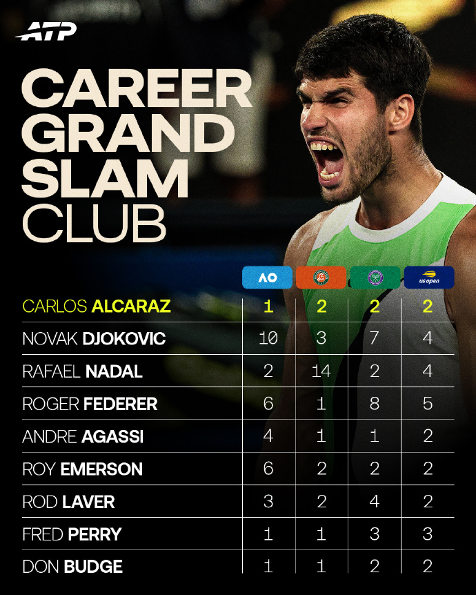 Alcaraz, winning the Australian Open for the first time, became the ninth male player in history to complete a career Grand Slam, officially joining tennis's elite club. He also set a personal record by breaking the youngest career Grand Slam record held by compatriot Nadal (24 years 101 days) at the age of 22 years 272 days.