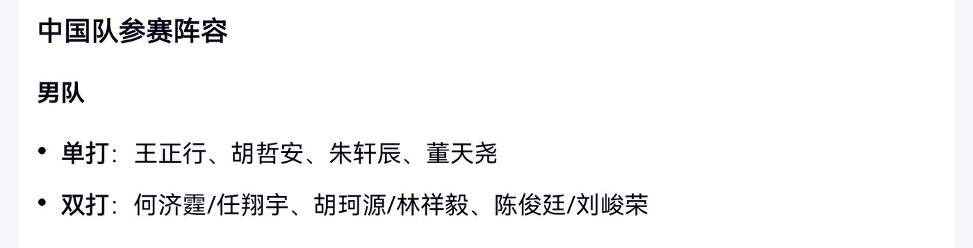 The lineup of the Chinese men's team players is shown below. You might wonder why most players are young and why Shi Yuqi, Li Shifeng, Weng Hongyang, and Lu Guangzu are not participating. This is because the 2026 Asian Badminton Team Championships also serve as the Thomas & Uber Cup qualifiers. As the defending Thomas Cup champions, China qualifies directly. Therefore, this tournament serves mainly as a training opportunity, with a squad composed mostly of younger players.