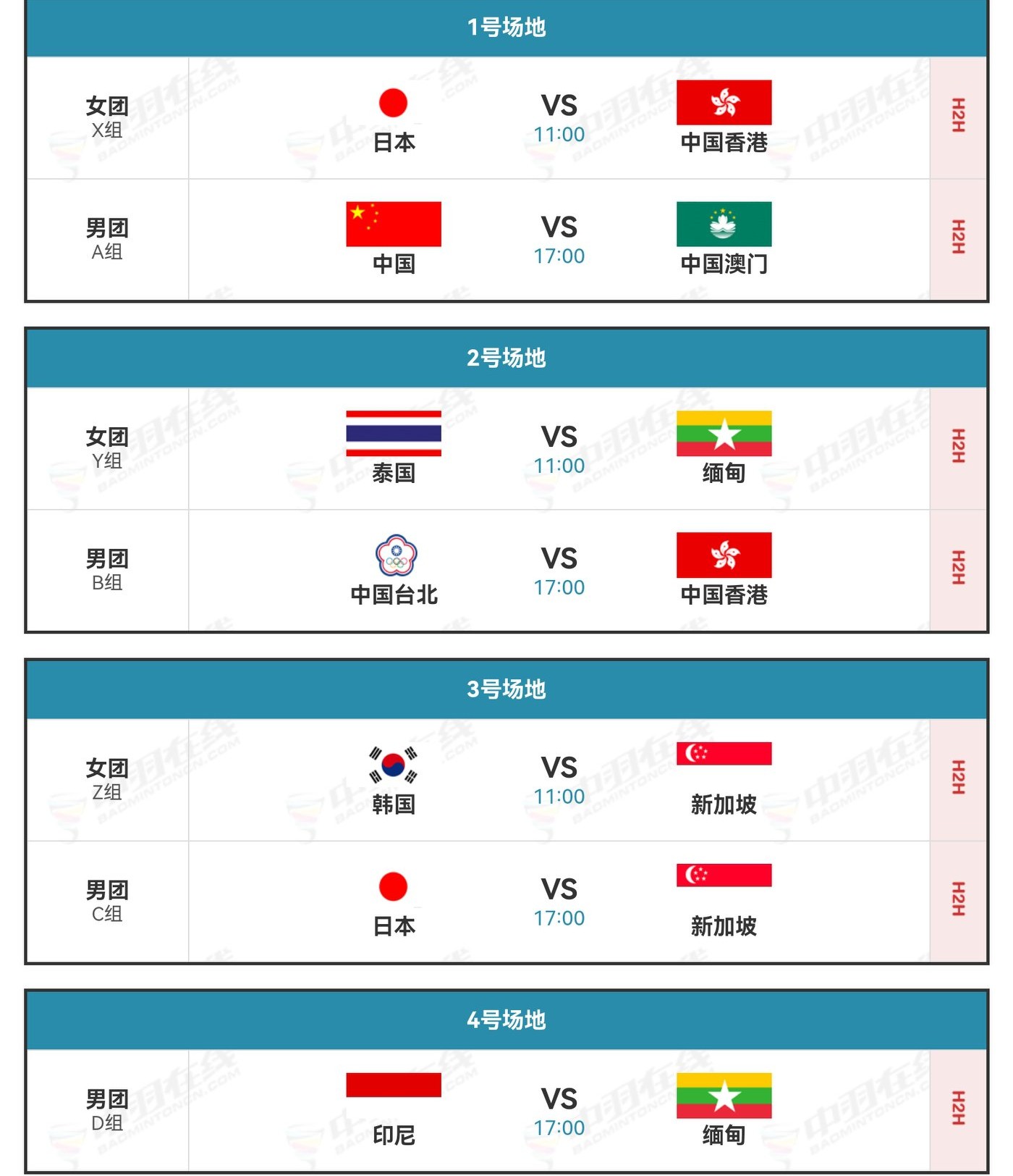 Tomorrow is the opening day of the Asian Badminton Team Championships, featuring seven matches in total, detailed in the image below. Notably, at 5 PM, the Chinese men's team will compete against Macau.