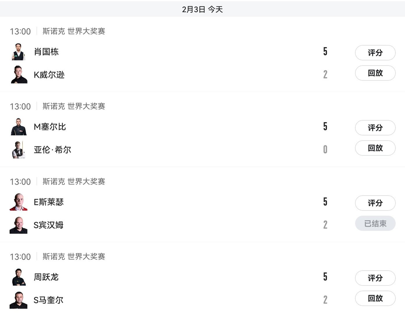 The latest from the Snooker World Grand Prix: Xiao Guodong and Zhou Yuelong have won their matches to enter the round of 16. Moreover, tonight (2026.2.3), Ding Junhui, Wu Yize, and other national players will be in action.