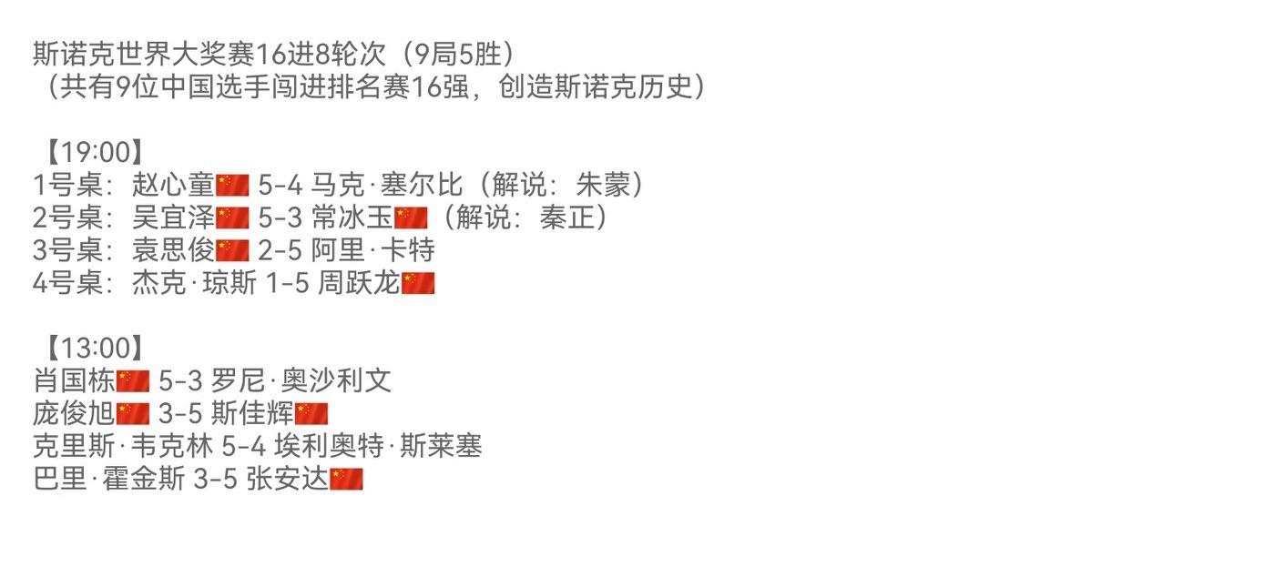 Special praise goes to Zhao Xintong, Xiao Guodong, Zhou Yuelong, and Zhang Anda. These four eliminated Selby, O'Sullivan, Jack Jones, and Barry Hawkins, greatly increasing the chances that national players will dominate the semifinals!