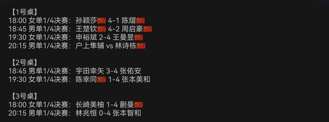 Tomorrow are the semifinals and finals. Three women have reached the semifinals, surrounding Mima Ito. Only Wang Chuqin from the men’s singles advanced, making the title defense quite challenging.