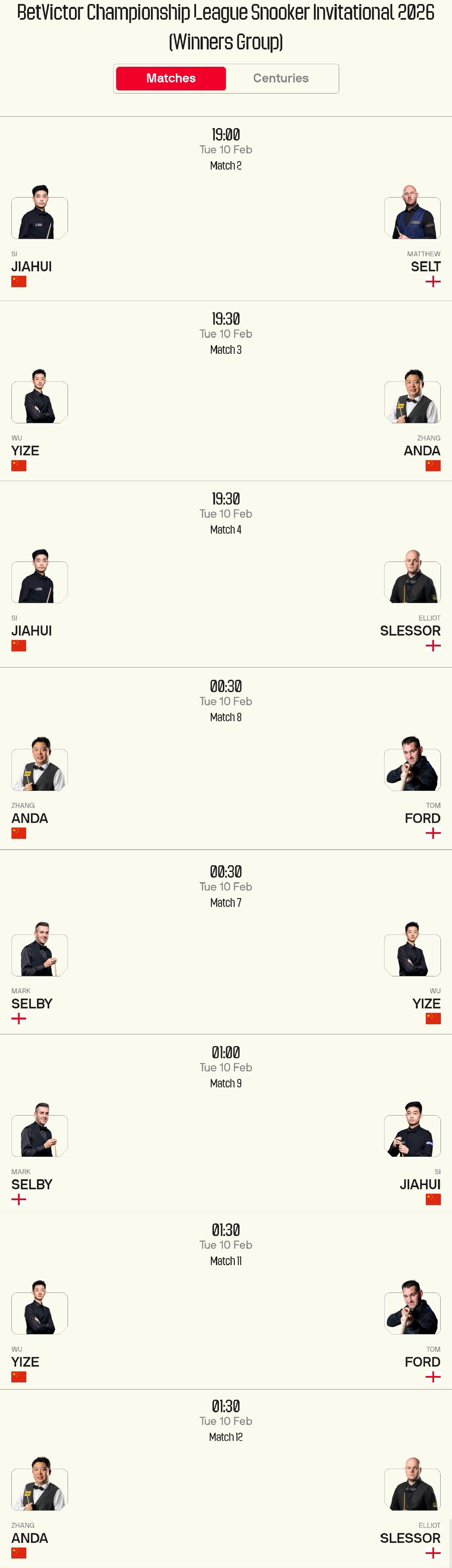 Tomorrow’s (2026.2.10) Snooker Championship League schedule includes Wu Yize, Si Jiahui, and Zhang Anda competing, with live coverage on Huya.