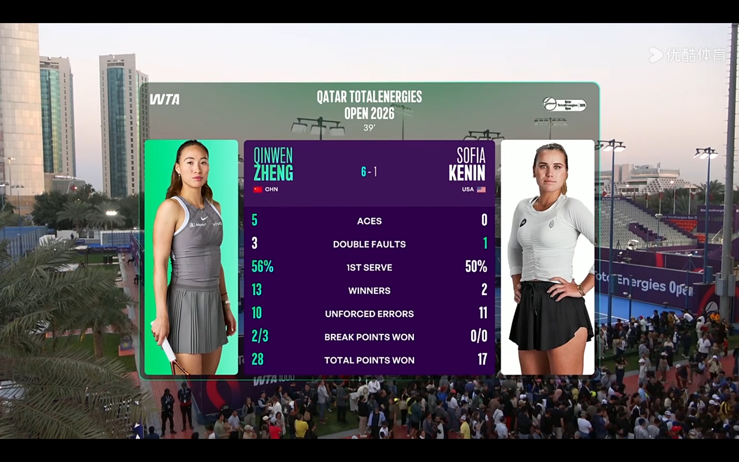 In the second set, Zheng Qinwen held serve throughout and broke twice, ultimately taking the set 6-1 to even the match at 1-1.