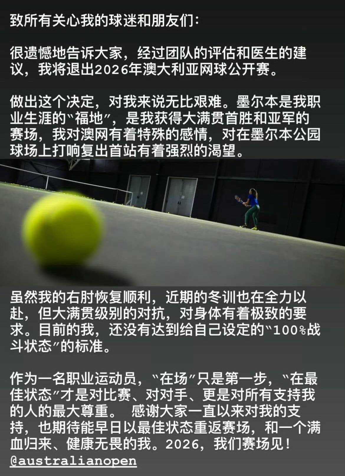 “Choosing not to go to the Australian Open really hurt me because I knew it stemmed from a poor decision we made earlier,” Zheng said. Notably, the “earlier decision” she referred to was about participating in the 2025 China Open. At that time, doctors told her she could compete, and she and her team followed that advice. However, months later, she realized her elbow hadn’t fully healed. This experience caused her to miss several subsequent tournaments and prolonged her elbow recovery.