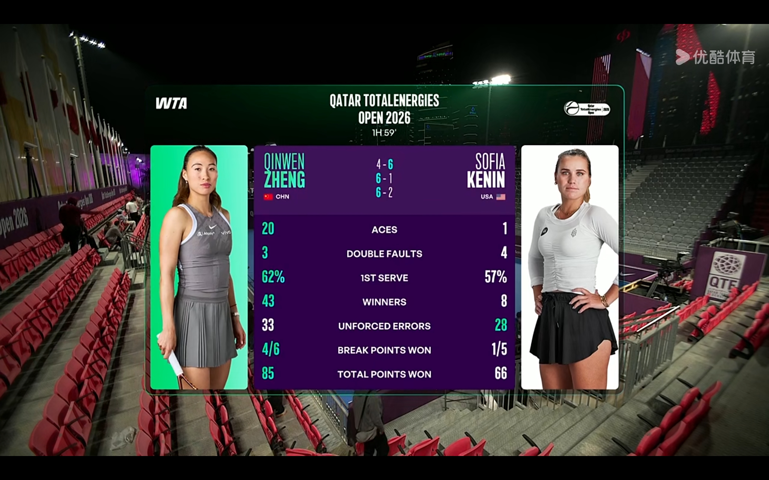 Check the stats below: Zheng hit 20 aces, 43 winners, had a high first-serve win rate, and secured four breaks of serve—an outstanding performance.
