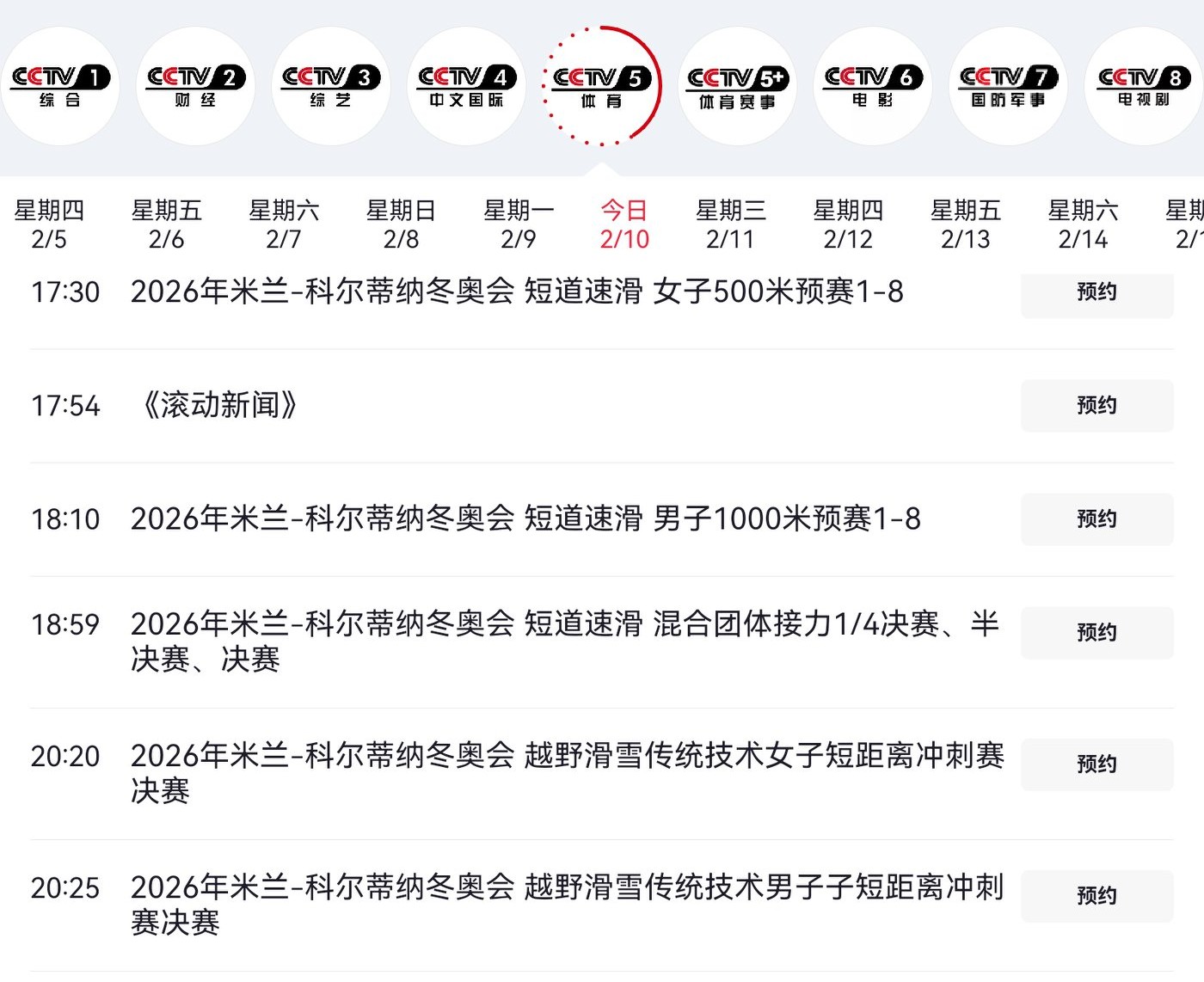 The Milan Winter Olympics schedule for today (2026.2.10) includes the opening of short track speed skating, with China aiming for a gold medal; live on CCTV-5.