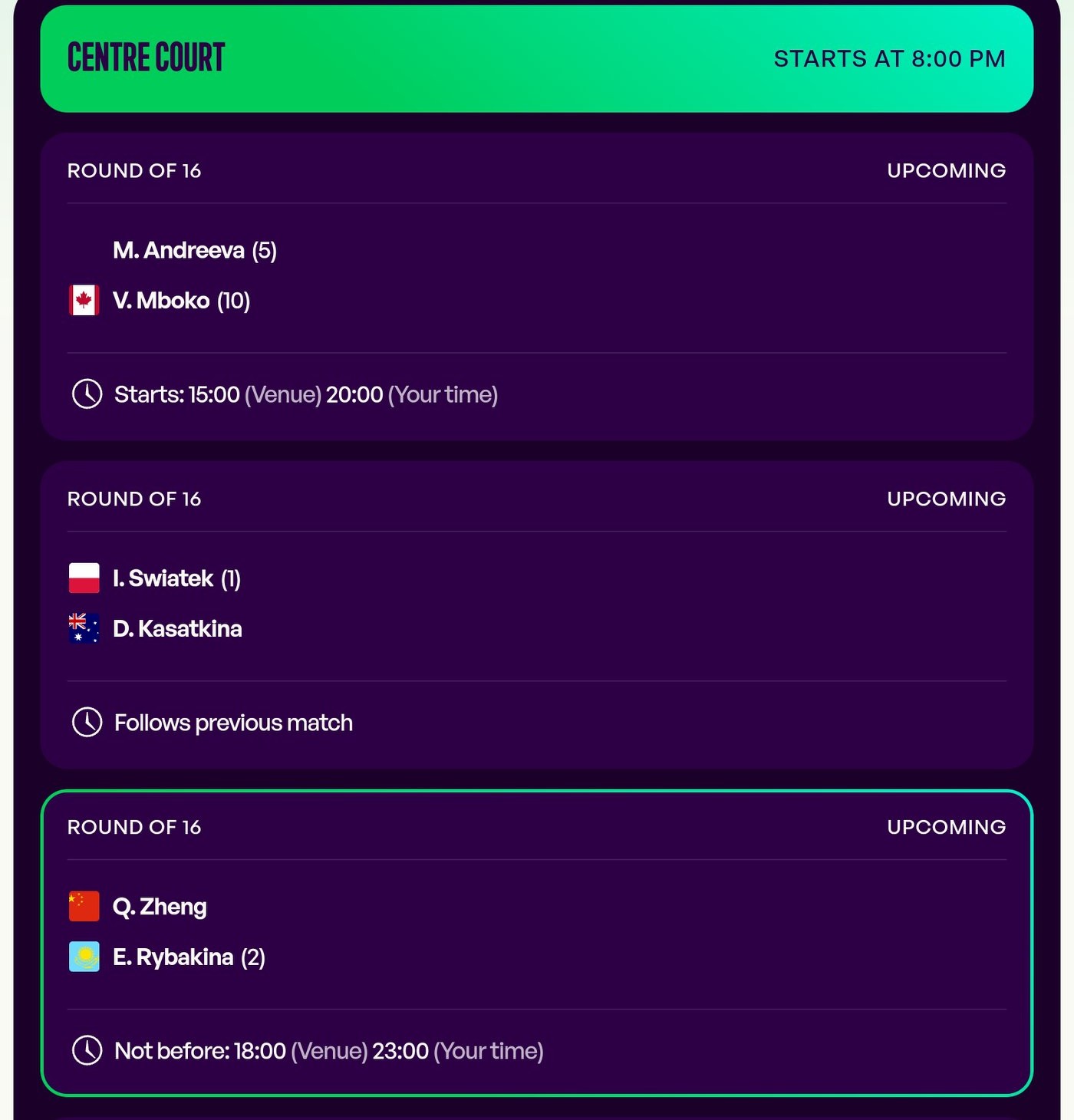 According to the official WTA schedule, Zheng Qinwen will play against Leylah Fernandez no earlier than 11 PM tonight!