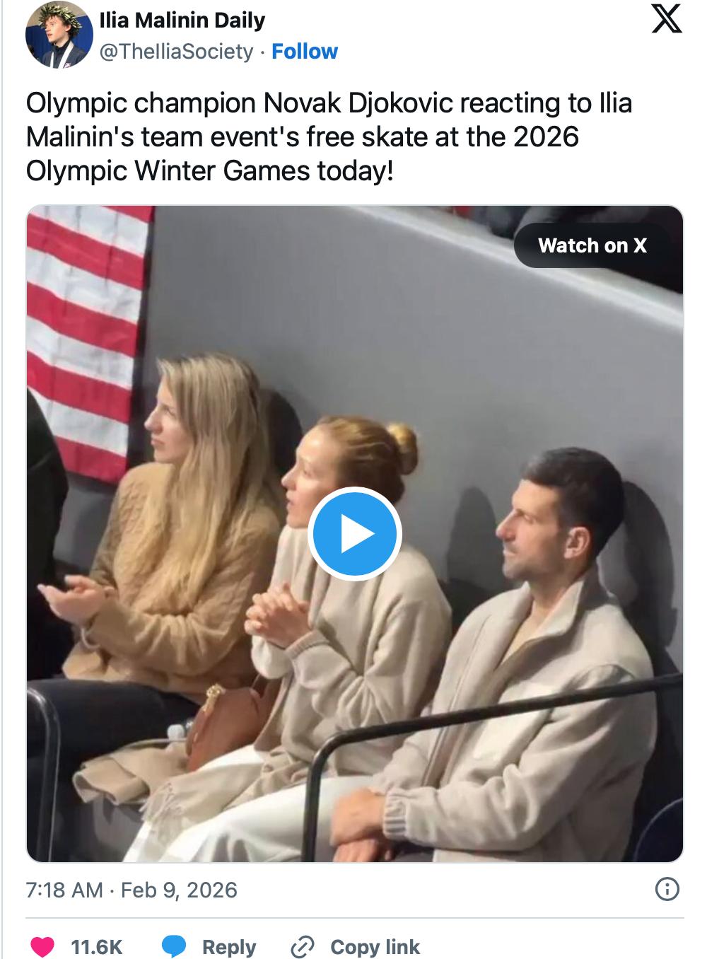 He sat close to the ice, applauding the athletes’ performances. After American rising star Ilia Malinin completed his free skate, Djokovic even stood up to applaud. Malinin later said, “I actually saw Djokovic; it was really unreal.”