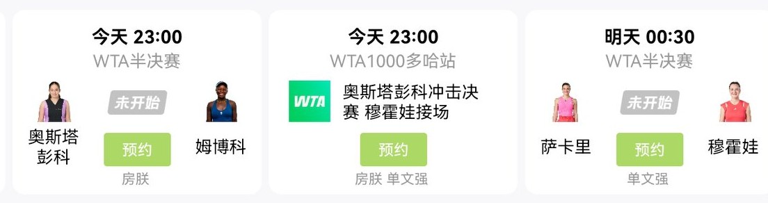 The tennis WTA1000 Doha event today (2024.2.13) will hold two semifinal matches, broadcast live on Migu Video + Youku.