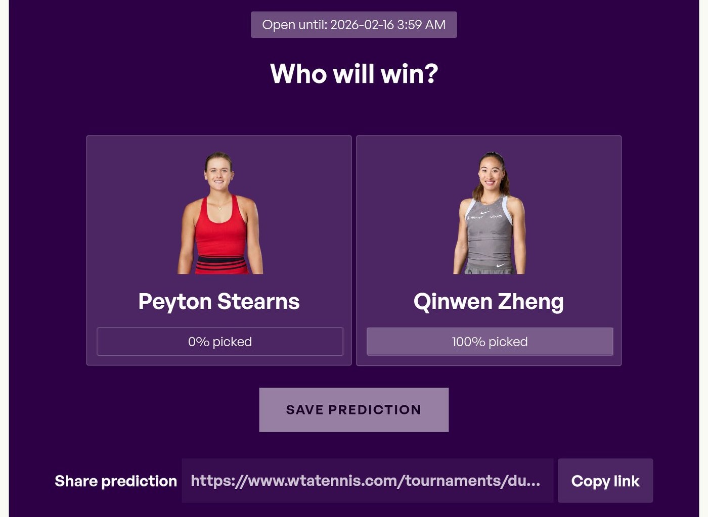 So, who will win today's match? The WTA official website's poll shows Zheng Qinwen with a 100% chance of victory.