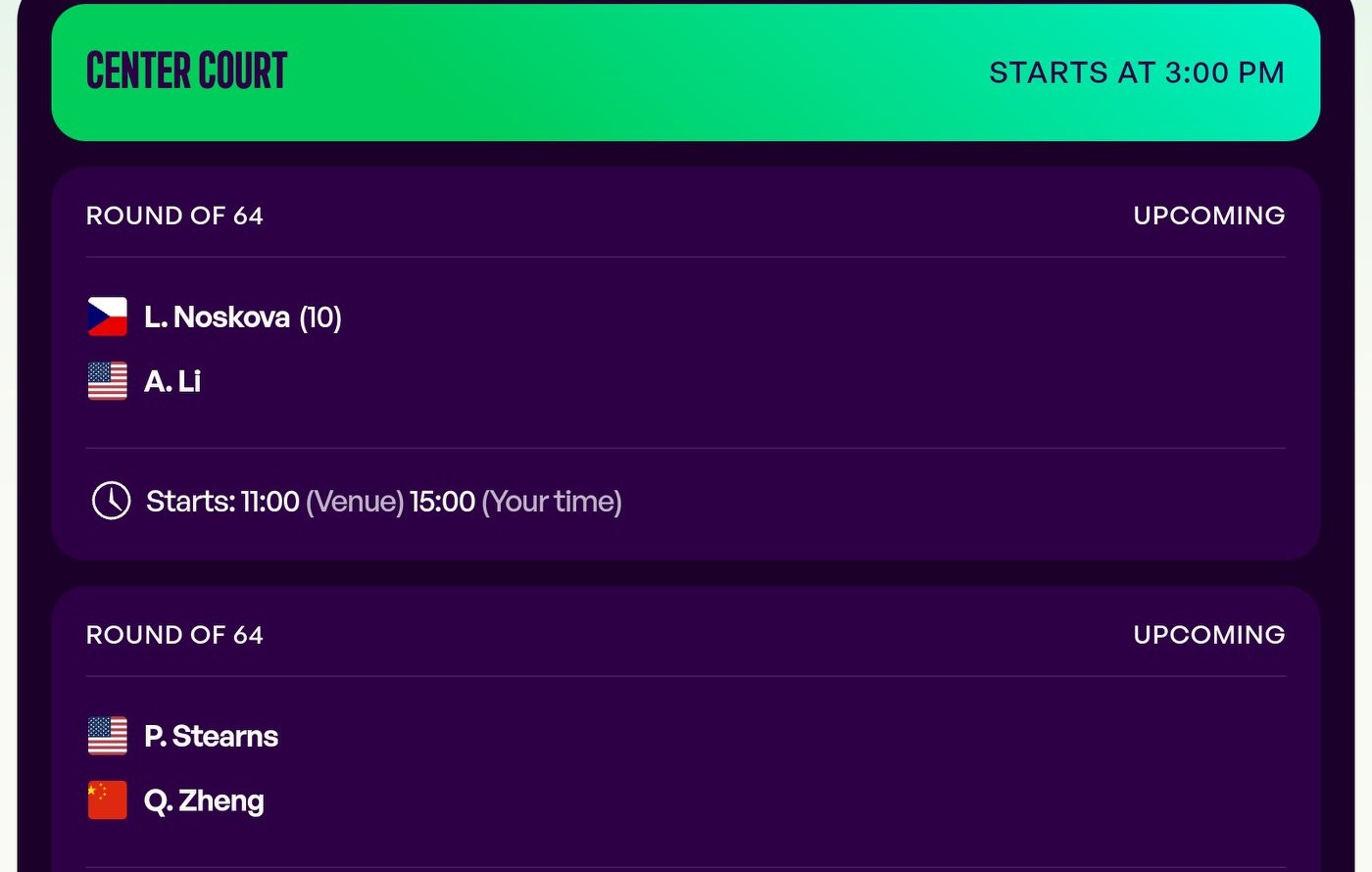As per the WTA's official schedule, the second match on the center court is set for about 4:30 PM today, featuring Zheng Qinwen versus Stearns.