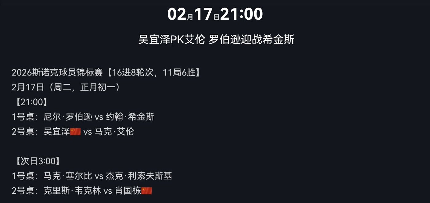 斯諾克球員錦標賽明天(2026年2月17日)賽程,吳宜澤與肖國棟將出戰,咪咕視頻與虎牙直播同步播出。