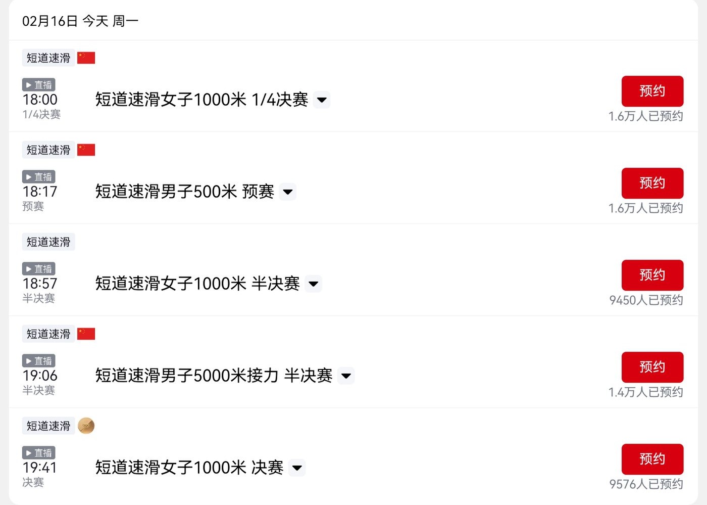 The details of China's participation in short track speed skating today are shown in the image below.