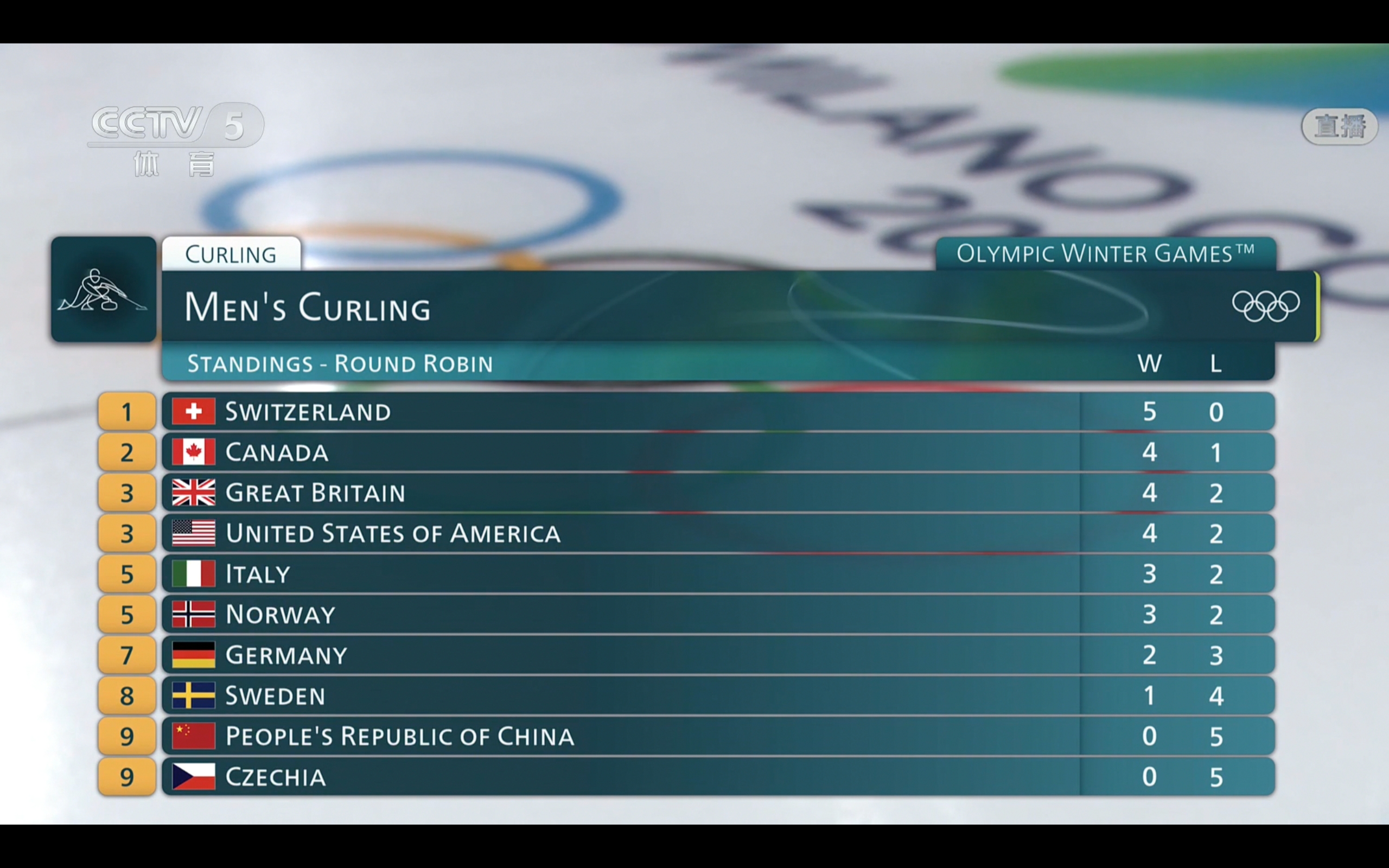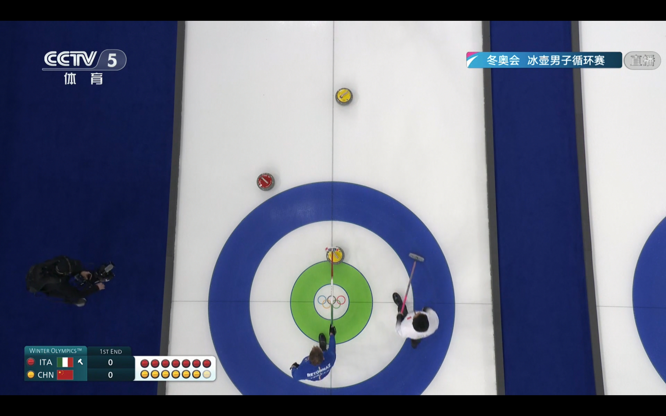 CCTV-5 and Yangshipin are broadcasting the men's curling round-robin match between China and Italy at the Milan Winter Olympics live.