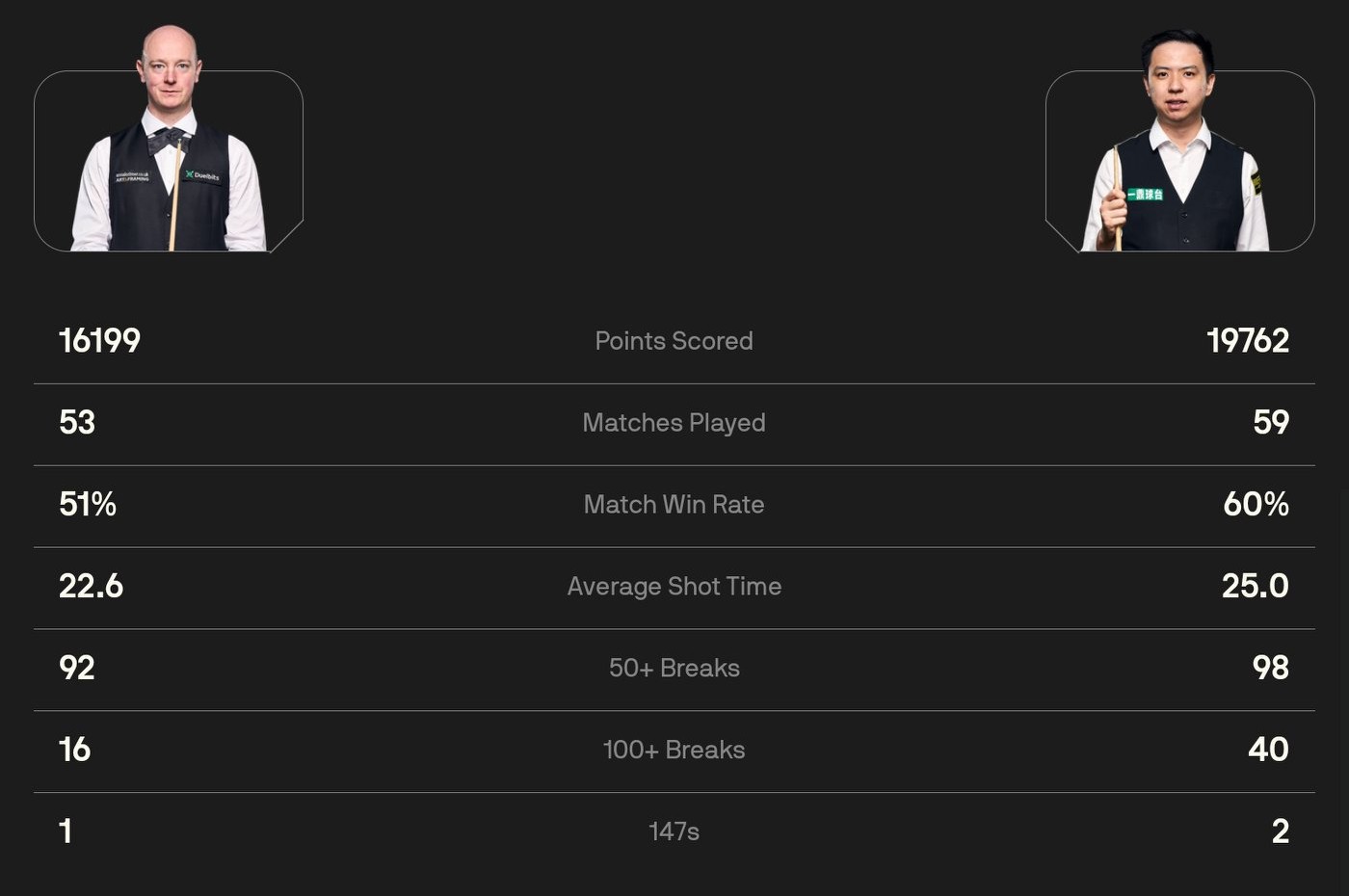 The first match today is Wu Yize versus Mark Allen. According to the stats below, Wu Yize leads in both 50+ and 100+ breaks and has even scored a 147 break, though his winning rate is slightly below Mark Allen’s. Still, I firmly believe Wu Yize will win 6-3 or 6-4 against Mark Allen.