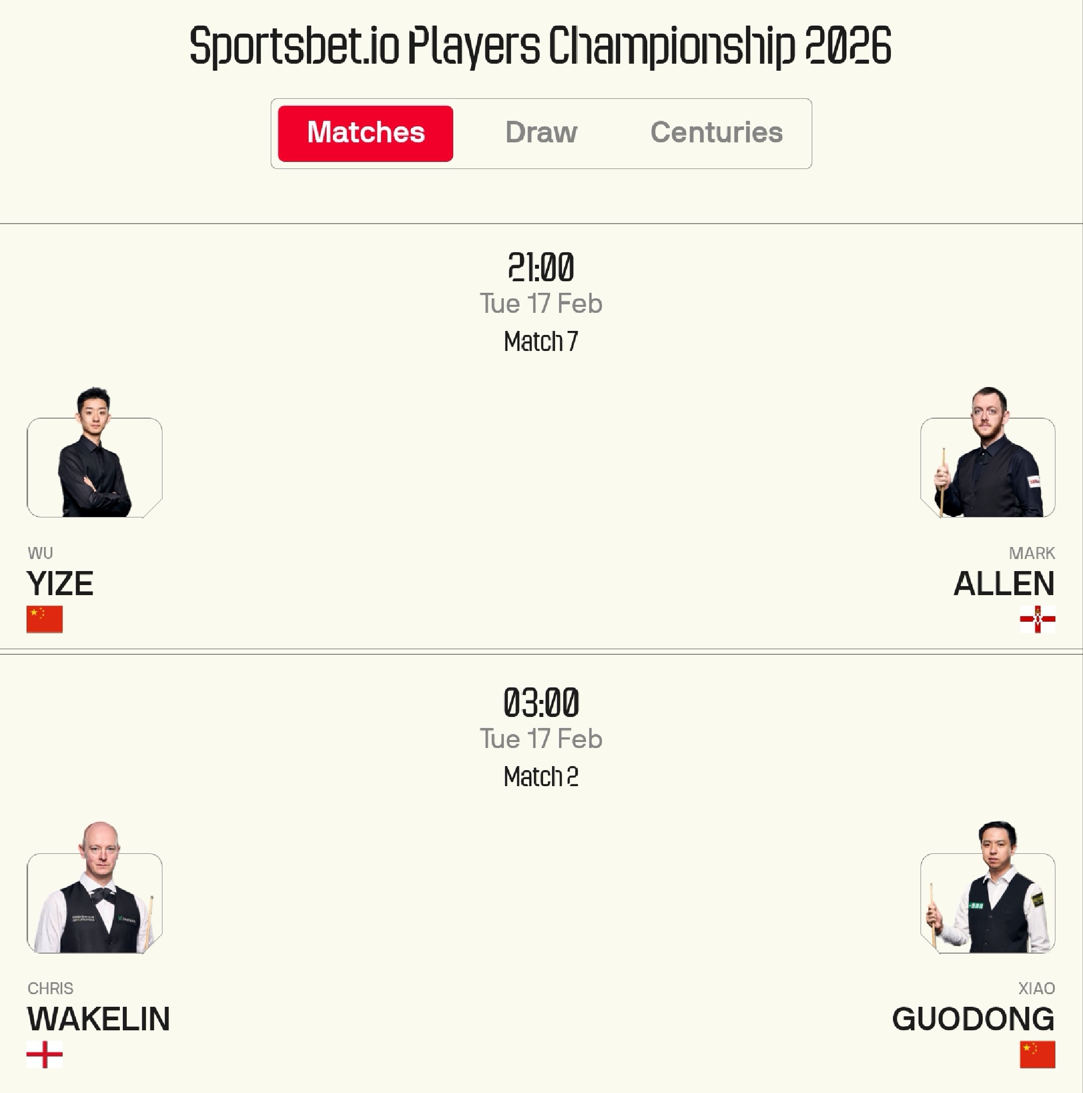 The Snooker Players Championship schedule for today (2.17) features Wu Yize and Xiao Guodong competing, with free live streaming on Huya.