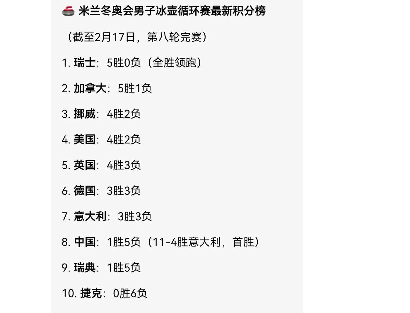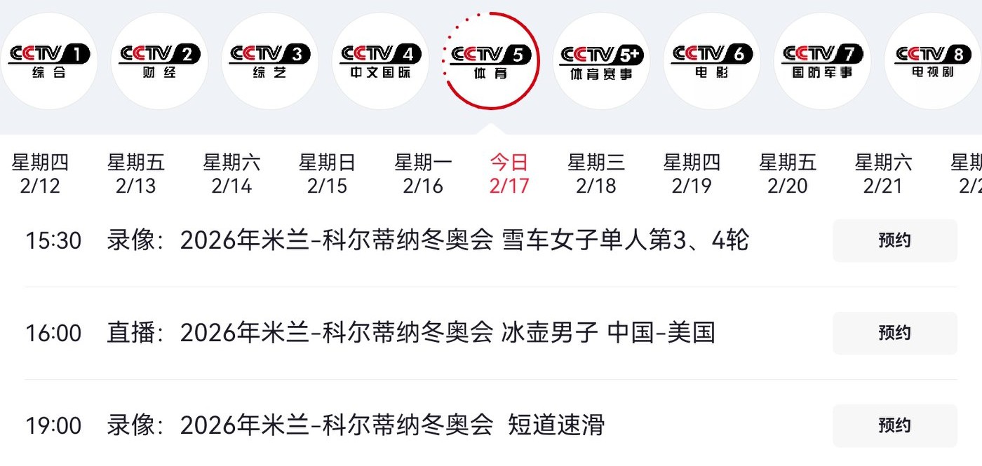 The Milan Winter Olympics men's curling round-robin match today (2026.2.17) is China vs. USA, live on CCTV-5.