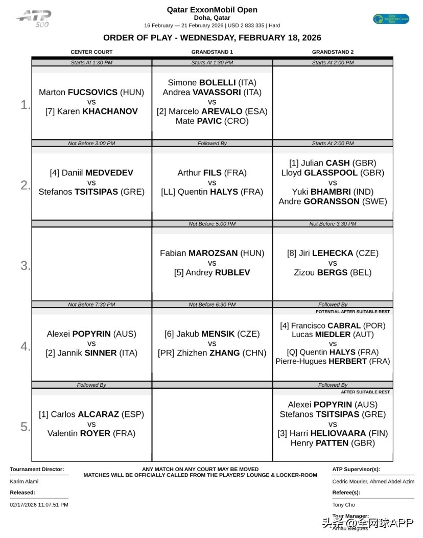 ATP 500 Doha schedule for February 18