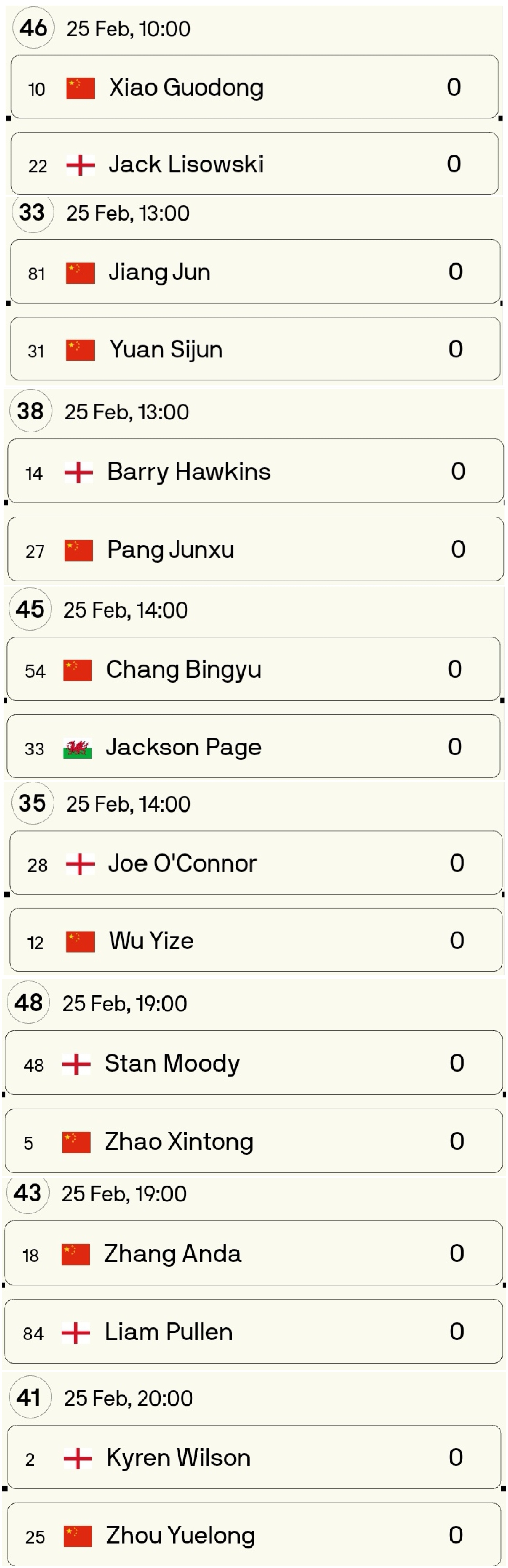 The Snooker Welsh Open schedule for today (2026.2.25) includes nine Chinese players such as Zhao Xintong, Wu Yize, Xiao Guodong, Zhang Anda, and Chang Bingyu, with live coverage on Migu Video, CCTV-5, and Huya.