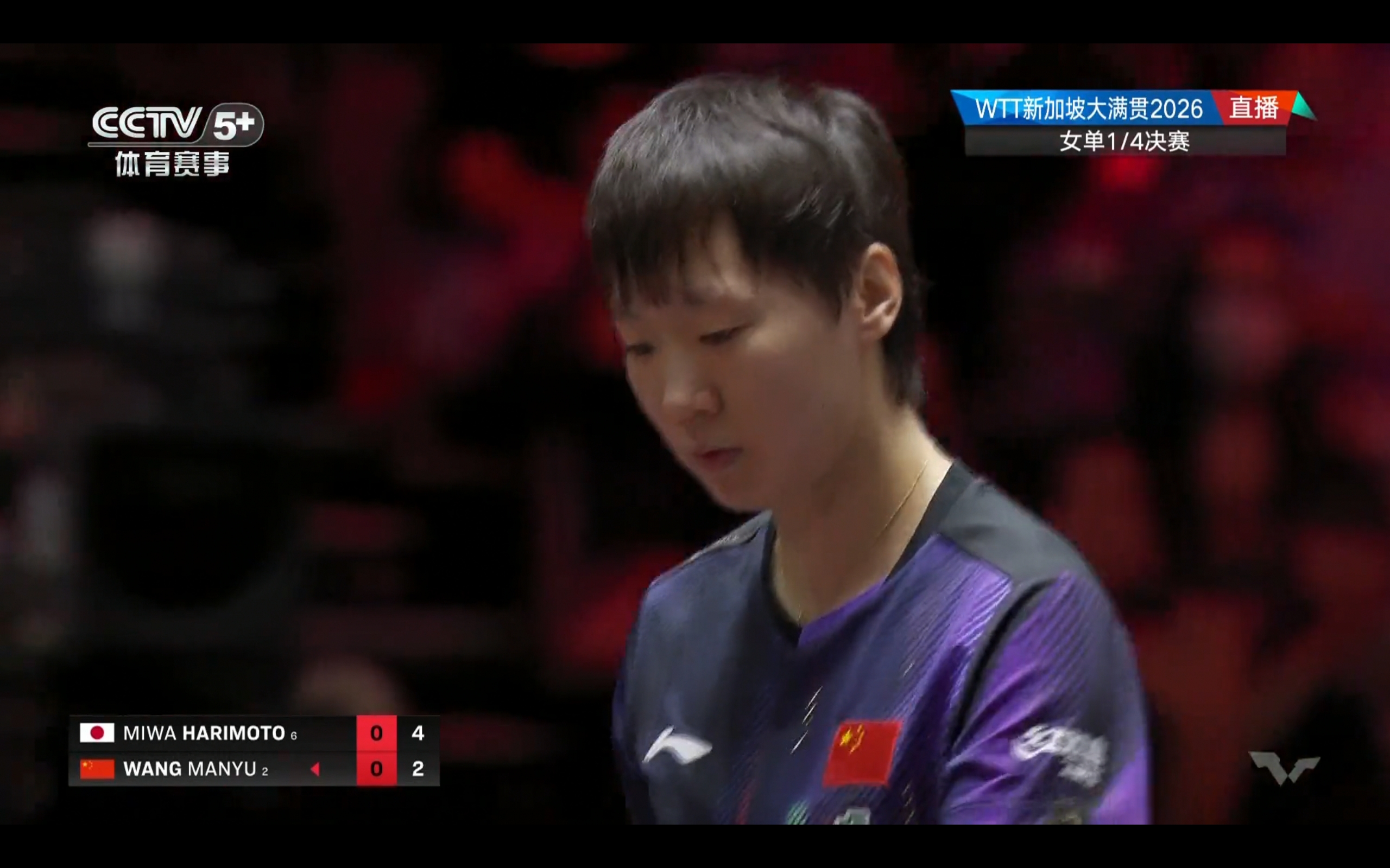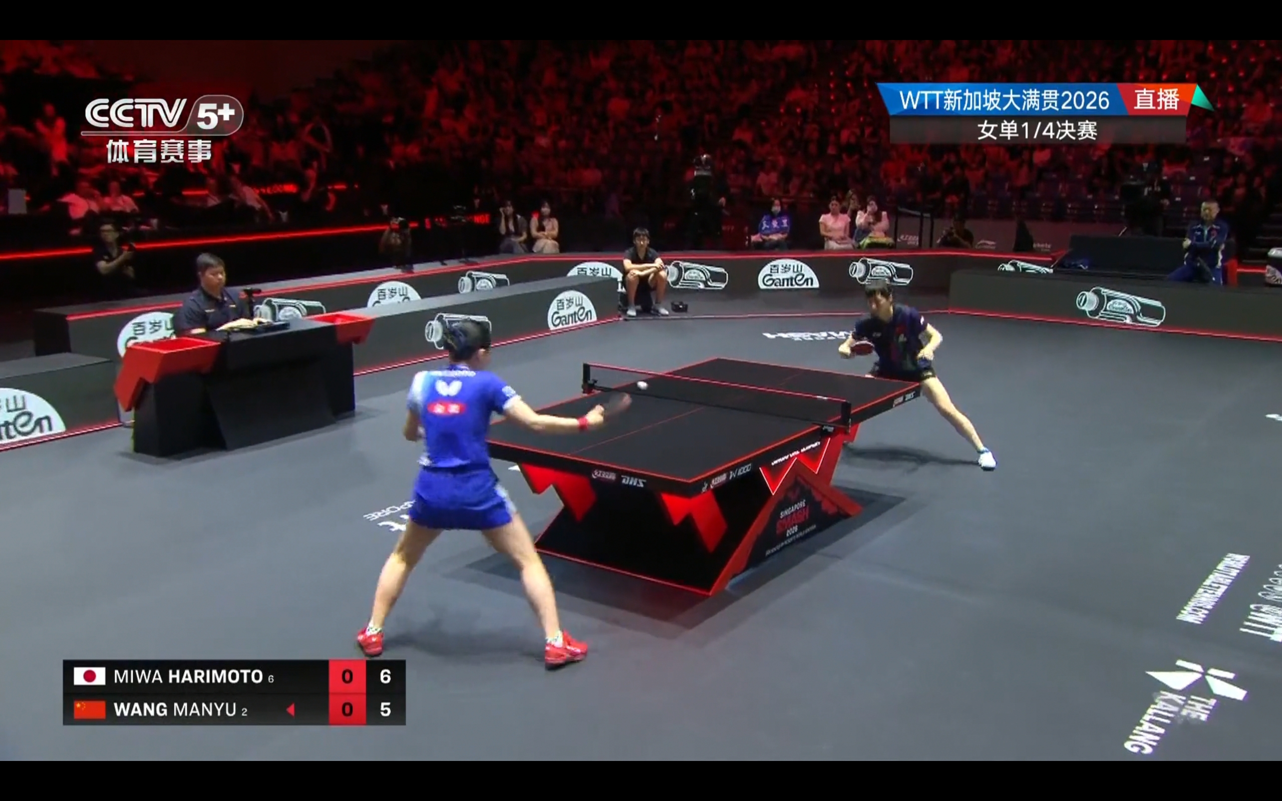 CCTV-5+ is currently broadcasting the WTT Grand Smash Singapore quarterfinal match between Wang Manyu and Miwa Harimoto.
