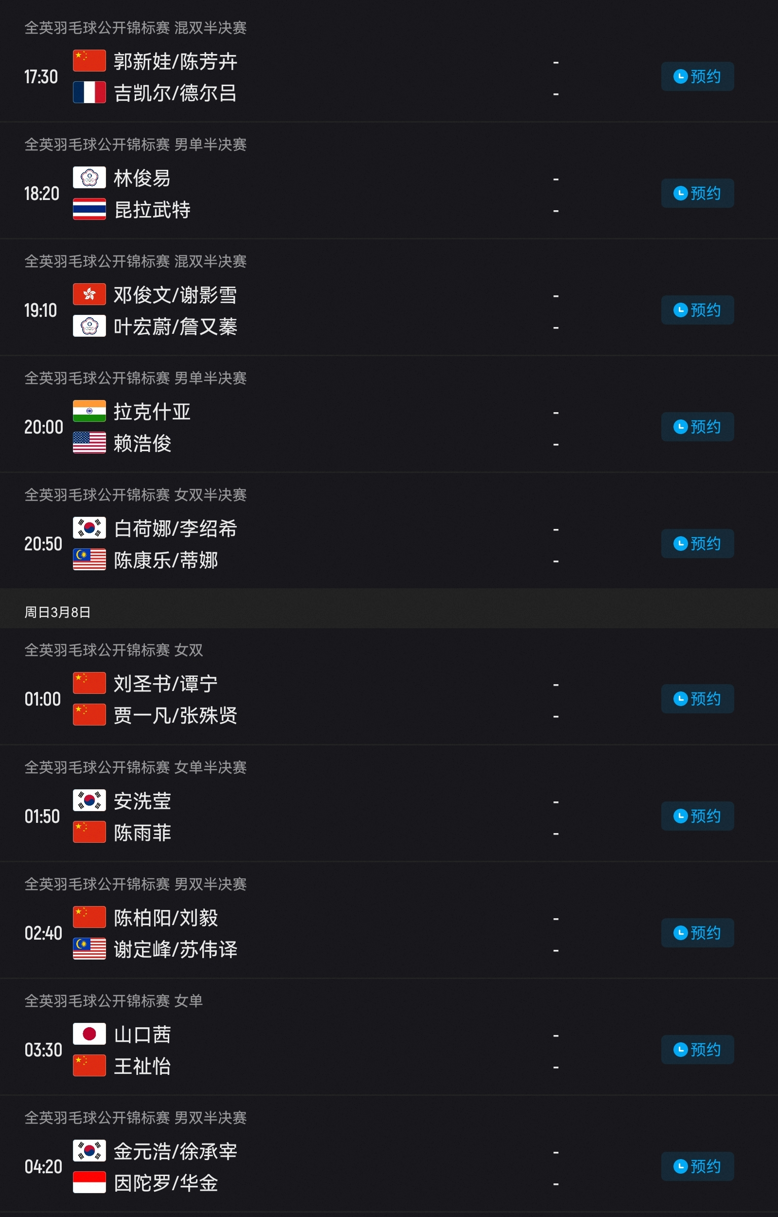 Today's (March 7) schedule for the All England Open Badminton Championships features five matches involving Chinese national team players, with live streaming on CCTV Video and Youku.